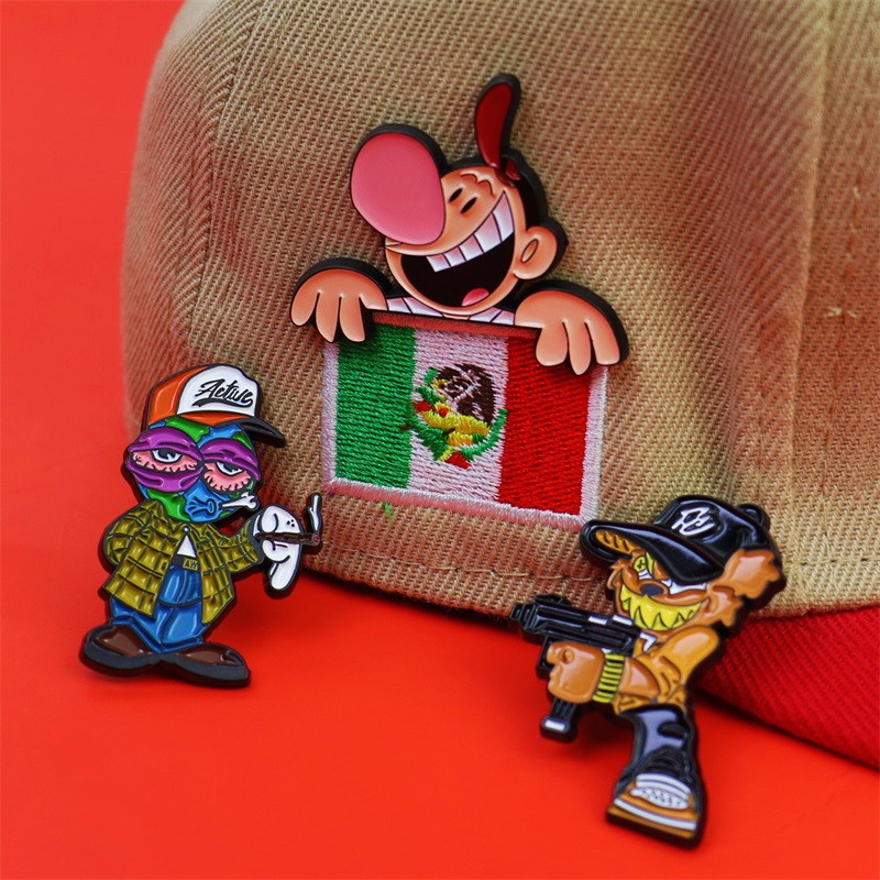 Bold cartoon-style designs (masked figure, clown, armed character) with vibrant hues, finished in sleek blackened metal. Durable soft enamel, 2D cutout shapes—edgy, eye-catching accessories for hats & bags.