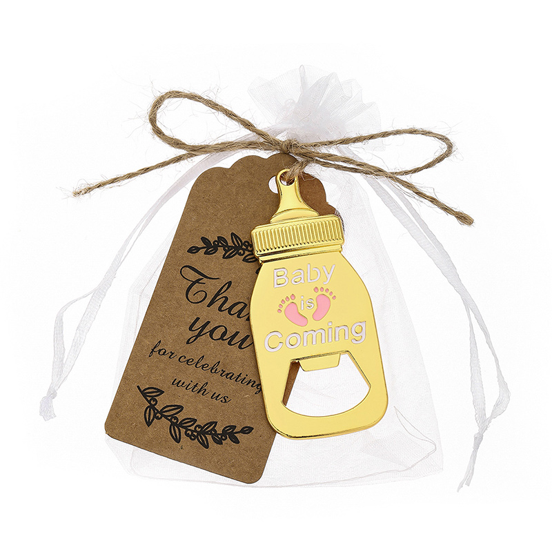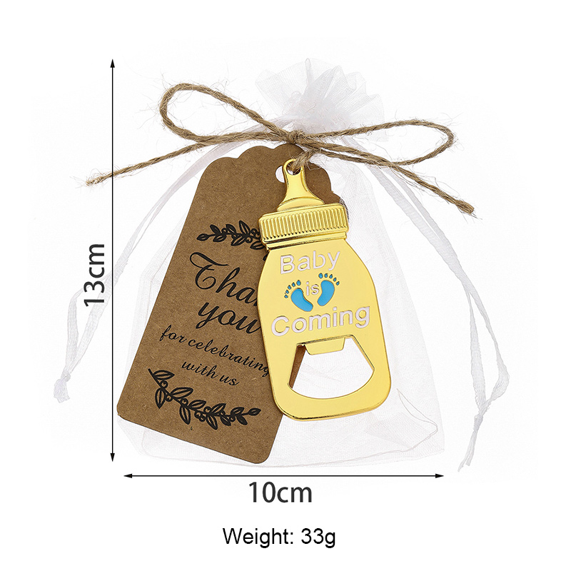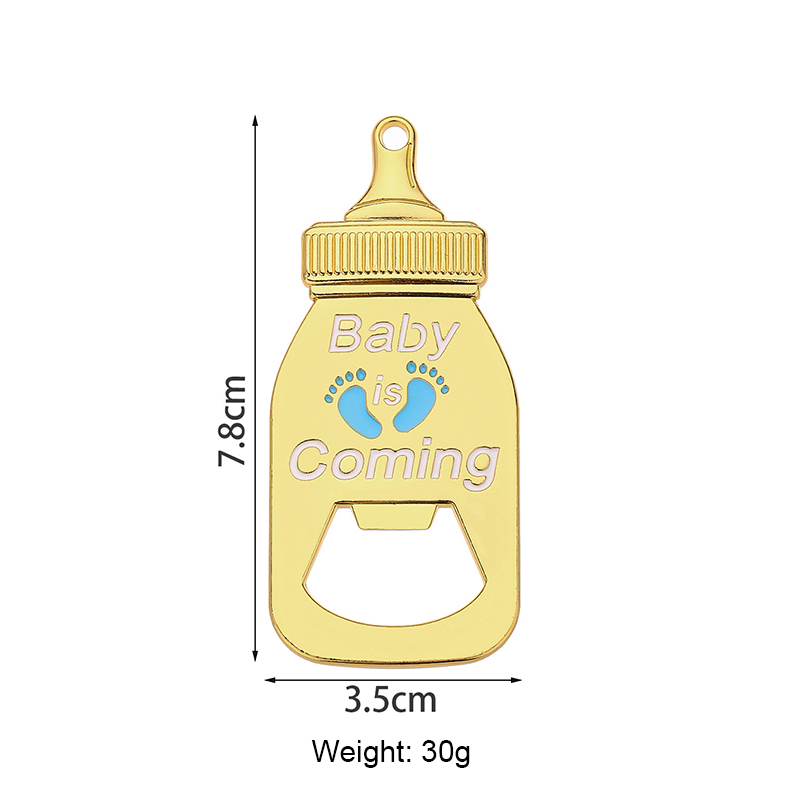 This 30g (7.8cm) shiny gold opener mimics a baby bottle, etched with "Baby is Coming" and tiny footprints. It pops caps easily, blending sweet baby-themed charm with festive flair—ideal for baby showers, gender reveals, or a heartfelt gift for expecting parents.