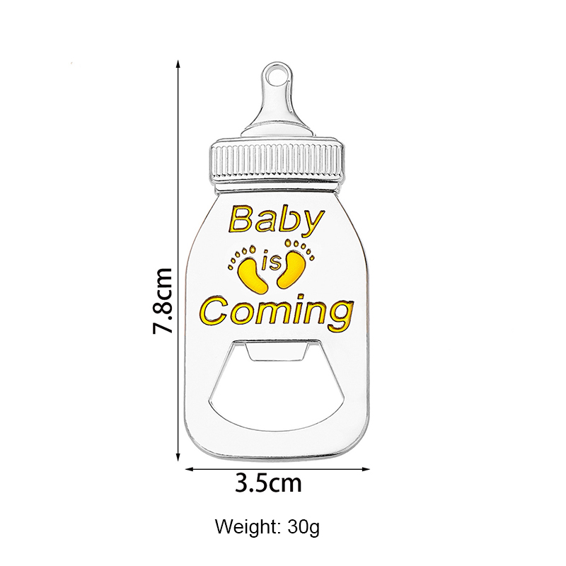 This 30g (7.8cm) silver opener mimics a baby bottle, printed with "Baby is Coming" and tiny footprints (in pink/blue/yellow). It pops caps easily, blending sweet baby-themed charm with festive flair—ideal for baby showers, gender reveals, or a heartfelt gift for expecting parents.