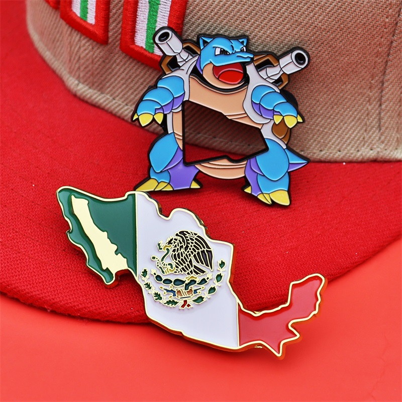 Featuring vibrant Pokémon Blastoise (with cannon details) & Mexico map (national emblem, gold trim), these pins decorate caps—ideal for Pokémon fans & Mexico culture lovers to add unique, themed flair.