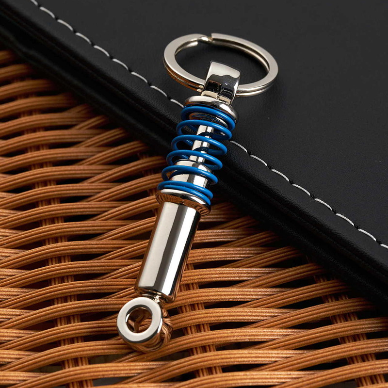 This keychain boasts a sleek metal shock absorber design, with a blue spring coiled around a silver cylindrical component, attached to a metal key ring. It embodies an industrial, automotive-inspired aesthetic, blending mechanical detailing and polished metal for a distinctive, gearhead-friendly look.