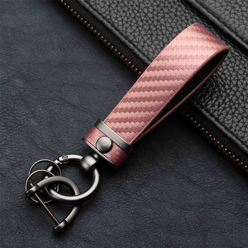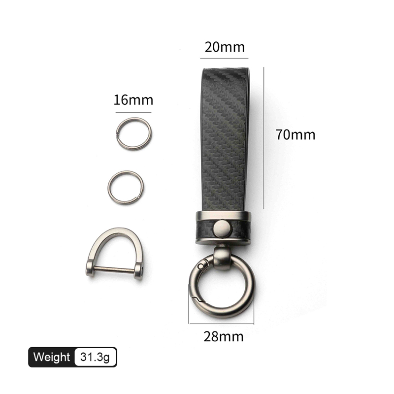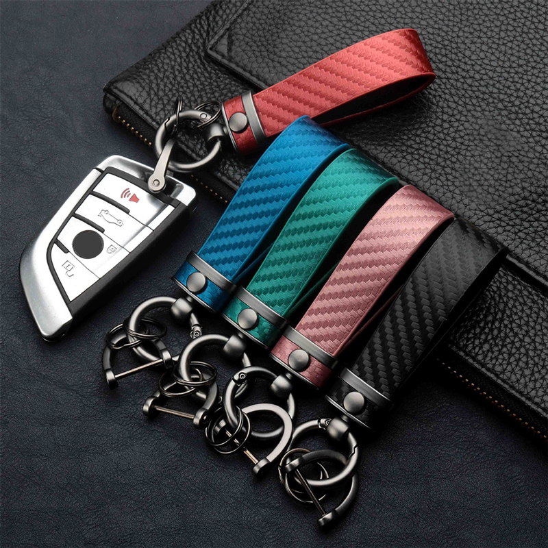 This keychain set features carbon fiber straps in red, blue, green, pink, and black, paired with robust metal hardware. With a sleek, sporty design, it’s ideal for car enthusiasts to organize keys, perfect for adding a high-tech touch to vehicle keys, and suits both daily use and automotive-themed lifestyles.