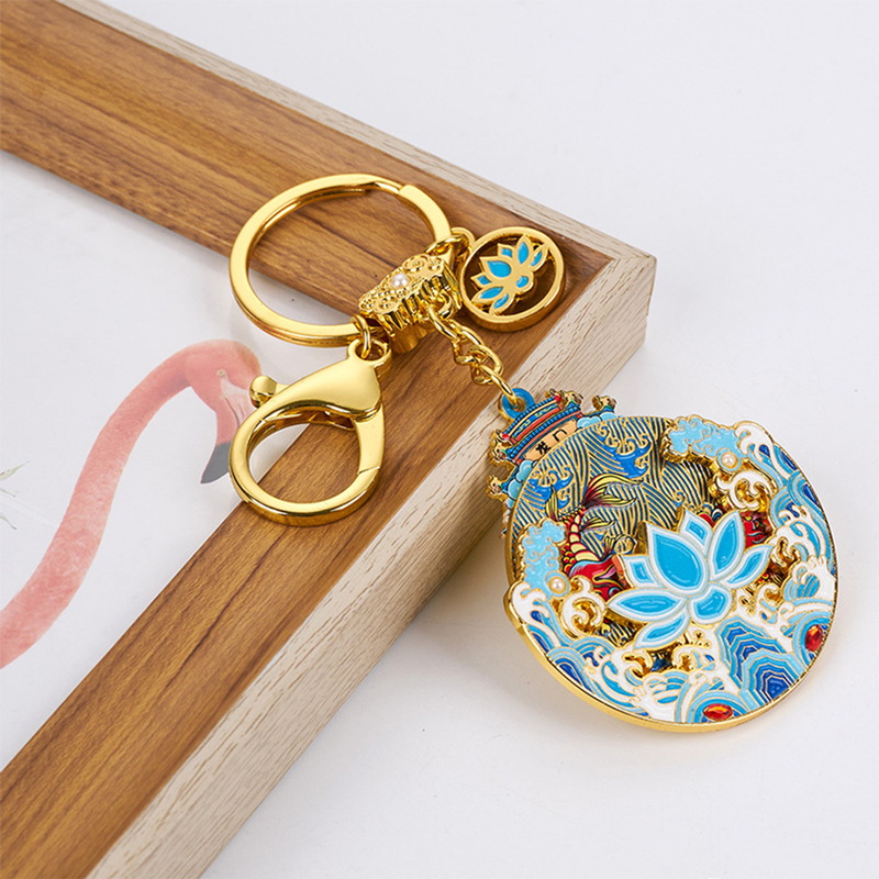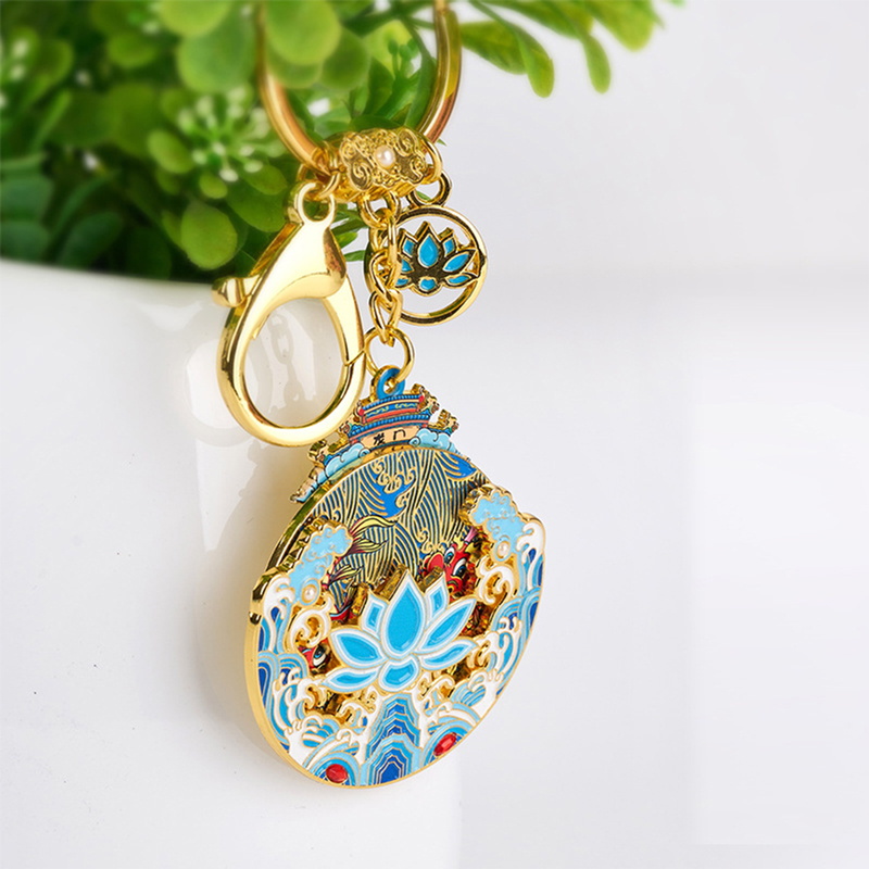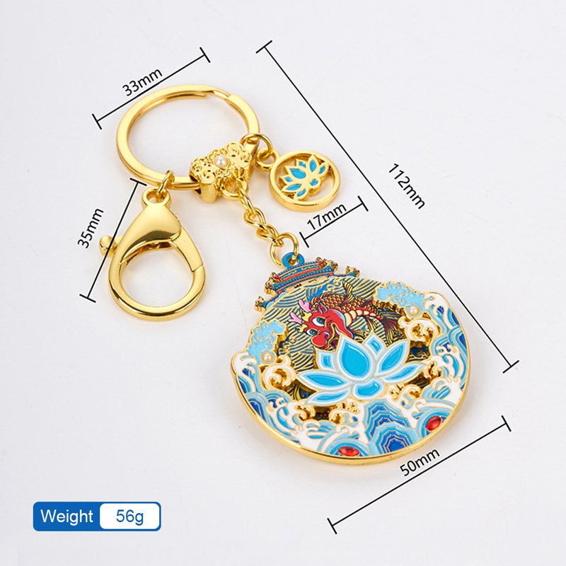 This keychain showcases a Chinese koi-leaping-dragon-gate design with enamel craftsmanship and golden details, featuring lotus and wave motifs. With a traditional cultural style, it’s great for daily key use, ideal for those who appreciate Chinese art, and serves as a meaningful gift for cultural enthusiasts or as a decorative accessory.
