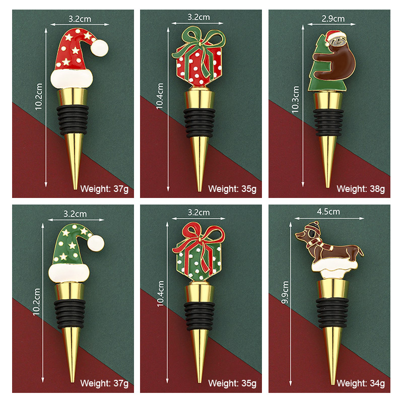 This set features festive shapes (Santa hat, gift box, sloth, dachshund) in classic red/green holiday hues, paired with gold bases. Each 34-38g stopper uses a silicone grip to seal wine tightly, doubling as Christmas decor—ideal for holiday parties, gifting, or adding seasonal cheer to wine collections.