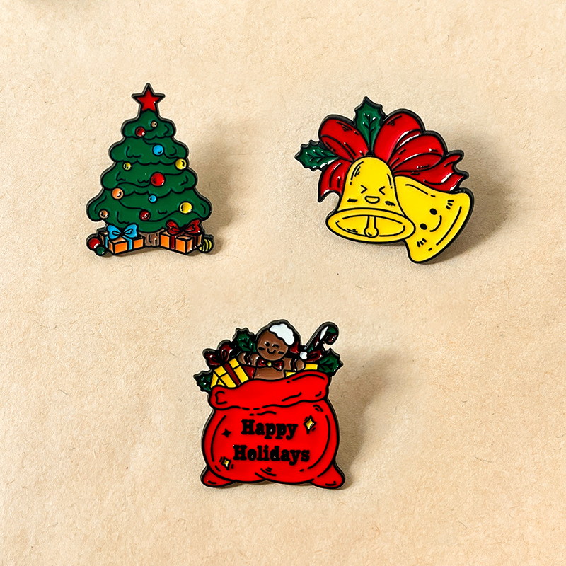 These Christmas pins feature varied festive shapes (sock, Santa, tree, bell, snow globe) with vivid colors and warm holiday details. They decorate caps or bags, adding cozy Christmas charm—perfect for holiday lovers to infuse accessories with festive joy.