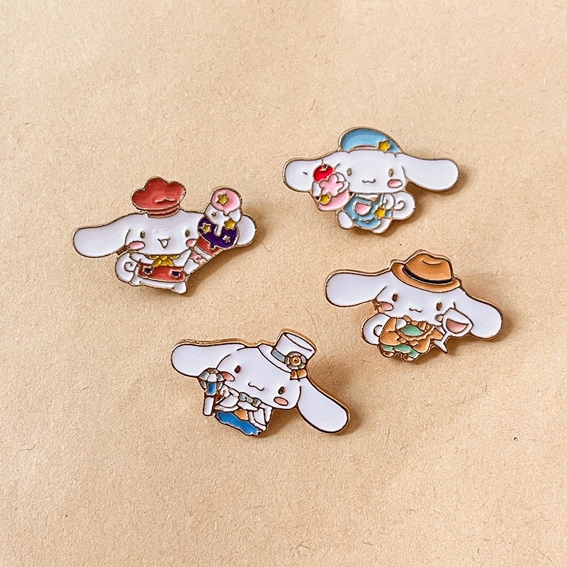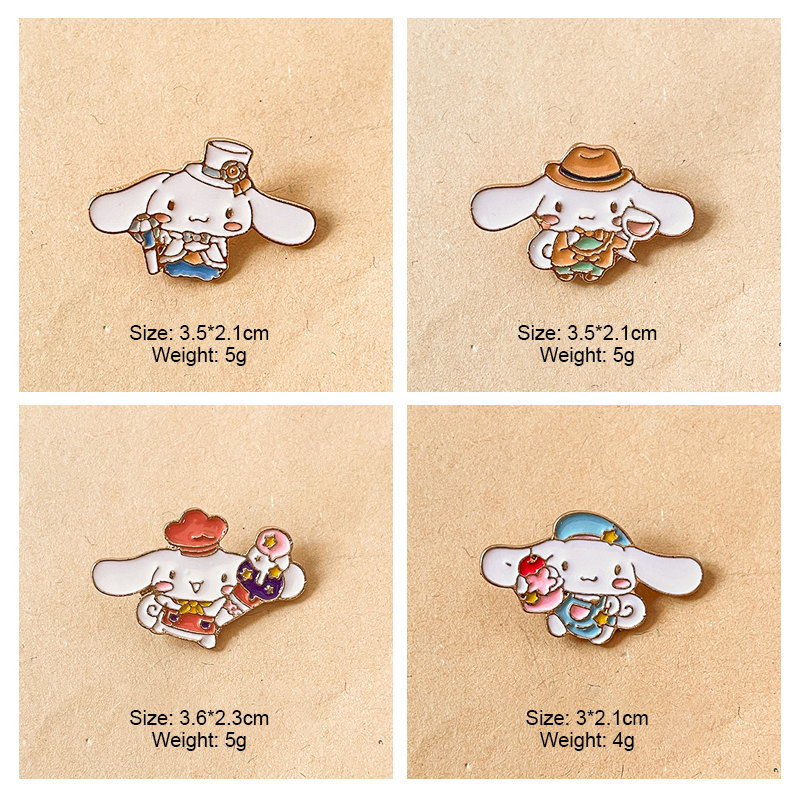 4 cute Cinnamoroll pins (with varied charming outfits) — whimsical, sweet flair. Perfect for Sanrio fans to add delicate style to bags/jackets; ideal for daily wear or cute character collectible decor.
