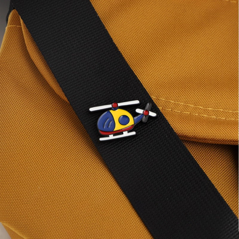 This vibrant helicopter pin boasts bold blue-yellow hues and retro styling—whimsical aviation charm. For transport/plane fans, it adds fun flair to bags/jackets, ideal for daily styling or livening outfits with playful, nostalgic aircraft personality.