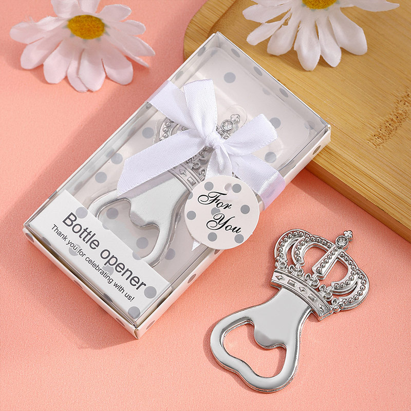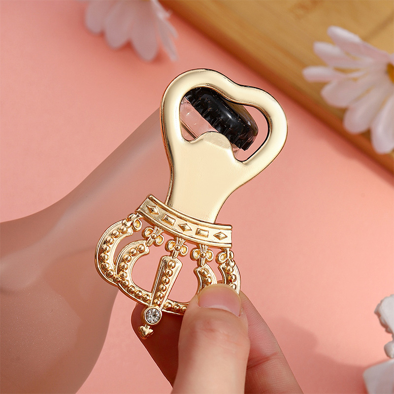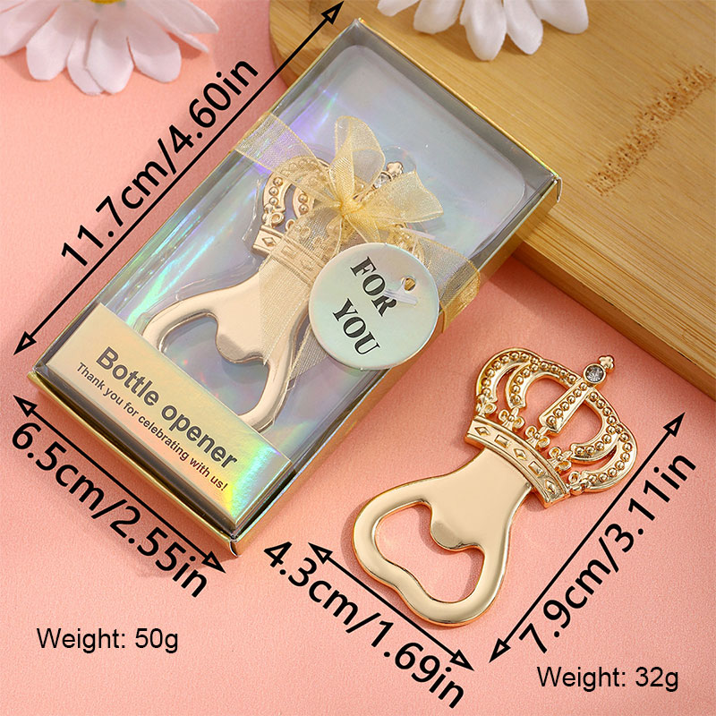 This 32-50g (7.9cm) opener features a sparkling crown design in gold/silver, with a heart-shaped opening. It easily pops bottle caps, making it a elegant favor for weddings, birthdays, or celebrations—packaged beautifully for gifting.