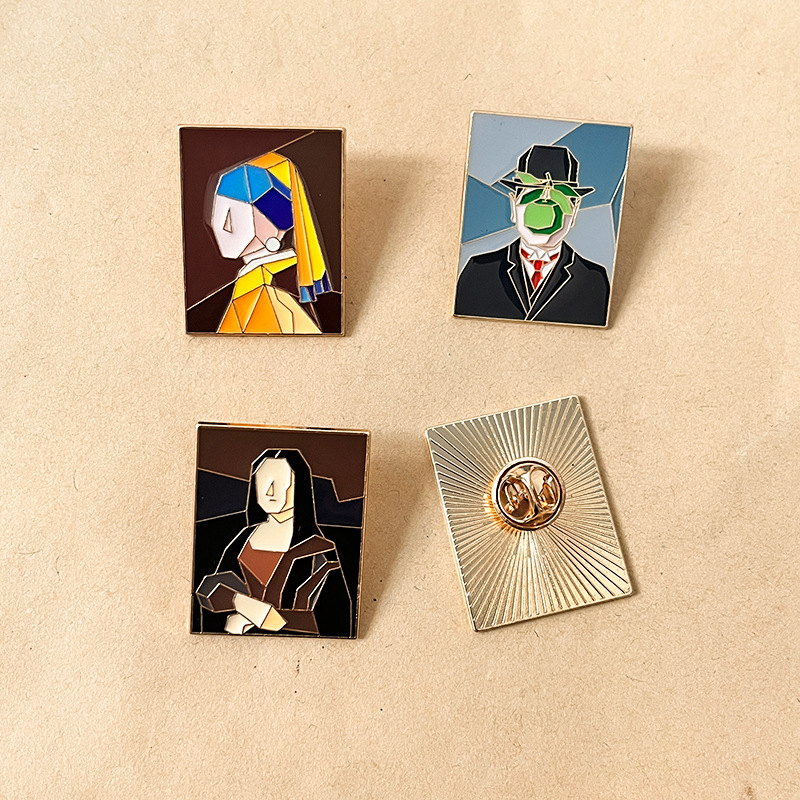 Features iconic artworks (Mona Lisa, Girl with a Pearl Earring) reimagined in bold cubist styles, with crisp enamel & gold borders. Ideal for art lovers to decorate bags, blazers, or hats—adds sophisticated, artistic flair to any look.