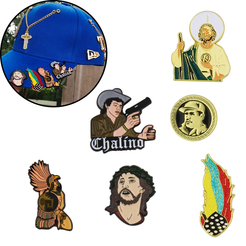 Intricate enamel-metal clips (spiritual, cultural figures) attach firmly to caps, blending meaningful symbolism with bold style for unique daily headwear decor.