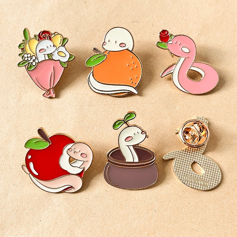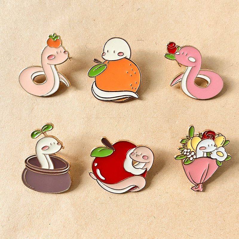 These 6 adorable snake pins feature whimsical designs (paired with fruits, flowers, and more)—playful, charming flair. Ideal for animal lovers to add cute, eye-catching style to bags/jackets; great for daily wear or quirky, whimsical decor.