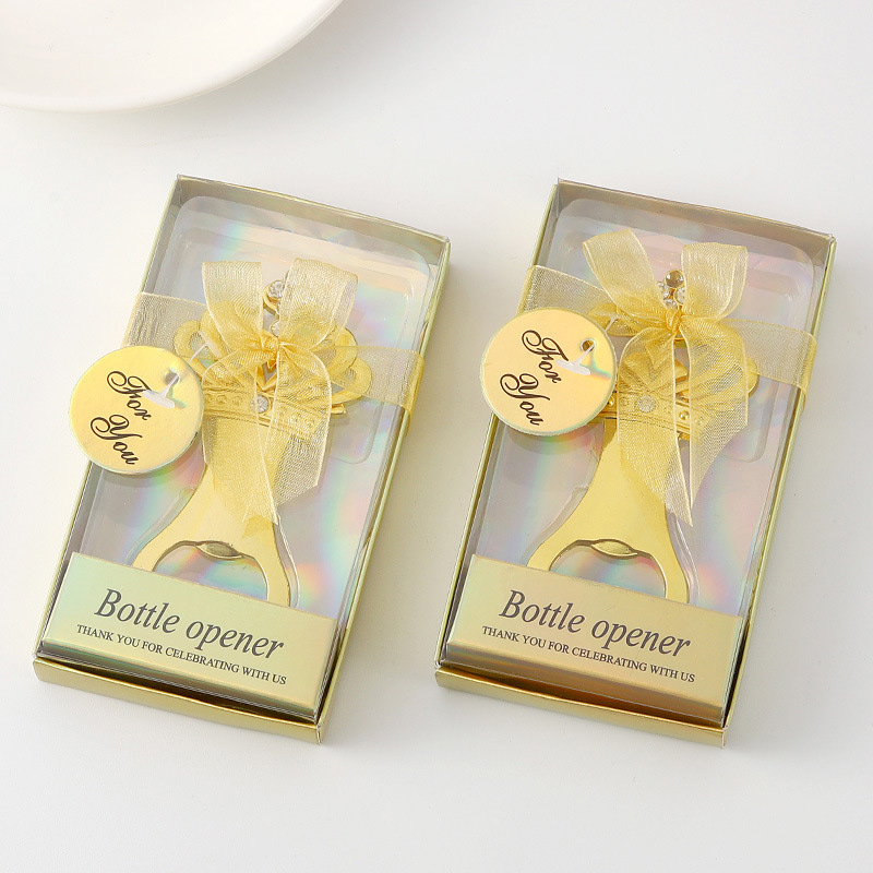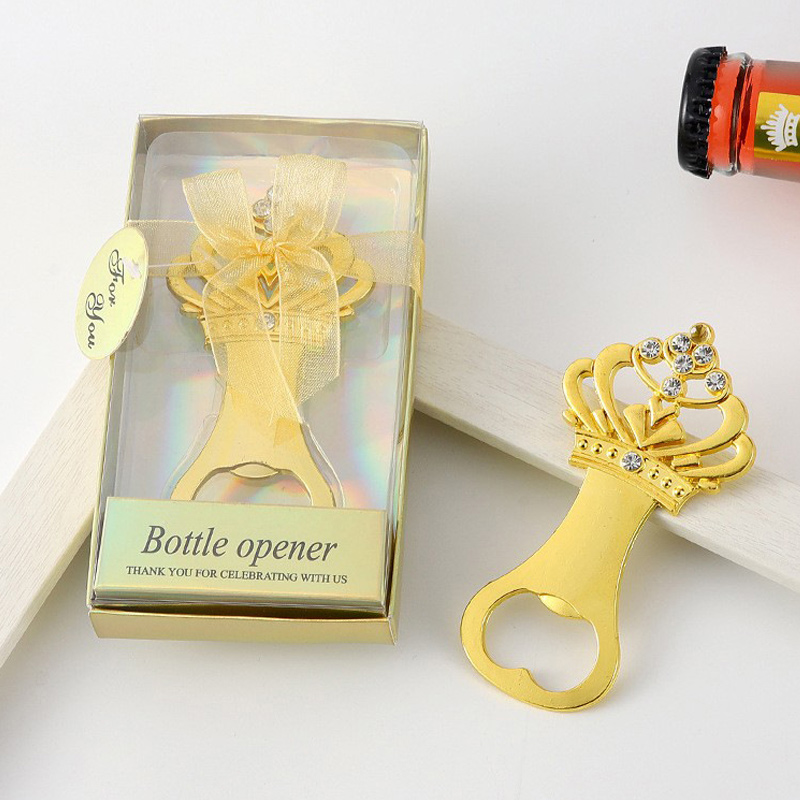 This 44g (11.5cm) gold opener features a sparkling crown design with embedded diamonds and a heart-shaped opening. It easily pops bottle caps, making it an elegant favor for weddings, birthdays, or royal-themed parties—packaged with a "For You" tag.