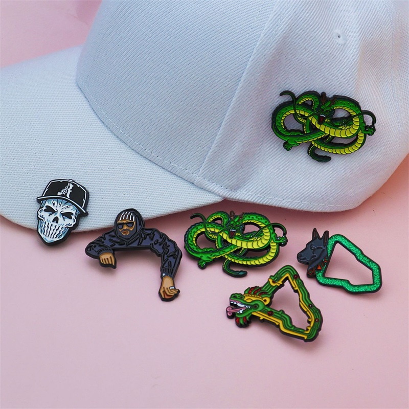 Edgy & Anime Hat Pin Set: Mix of bold designs—skull-in-cap, masked figure, coiled Shenron dragons. Vibrant enamel, dynamic silhouettes—fandom + street style, perfect for adding personality to hats/bags.