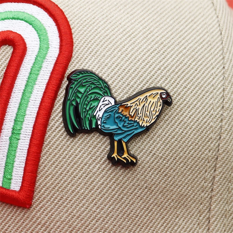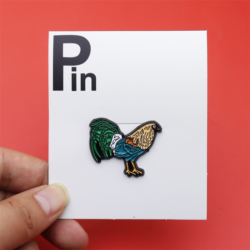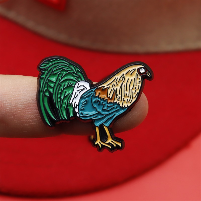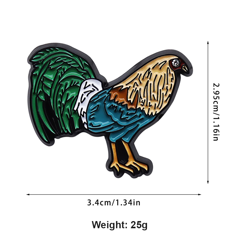 This pin takes the lifelike silhouette of a rooster, with layered shapes (fluffy tail feathers, curved body) for dimension. The design pairs bold, glossy enamel hues (teal, green, gold) with a sparkling accent eye and sharp black outlines—vibrant, detailed, and full of playful charm.