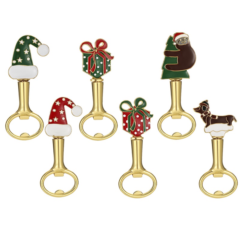 Product : Christmas-Themed Enamel Bottle Opener Set Weight: 43–46g Color : Gold These 43–46g (9.5–9.9cm) gold-accented openers feature festive designs (Santa hats, gifts, sloths). They easily pop bottle caps, blending colorful enamel charm with practicality—ideal for holiday parties, gifting, or adding seasonal flair to daily use.