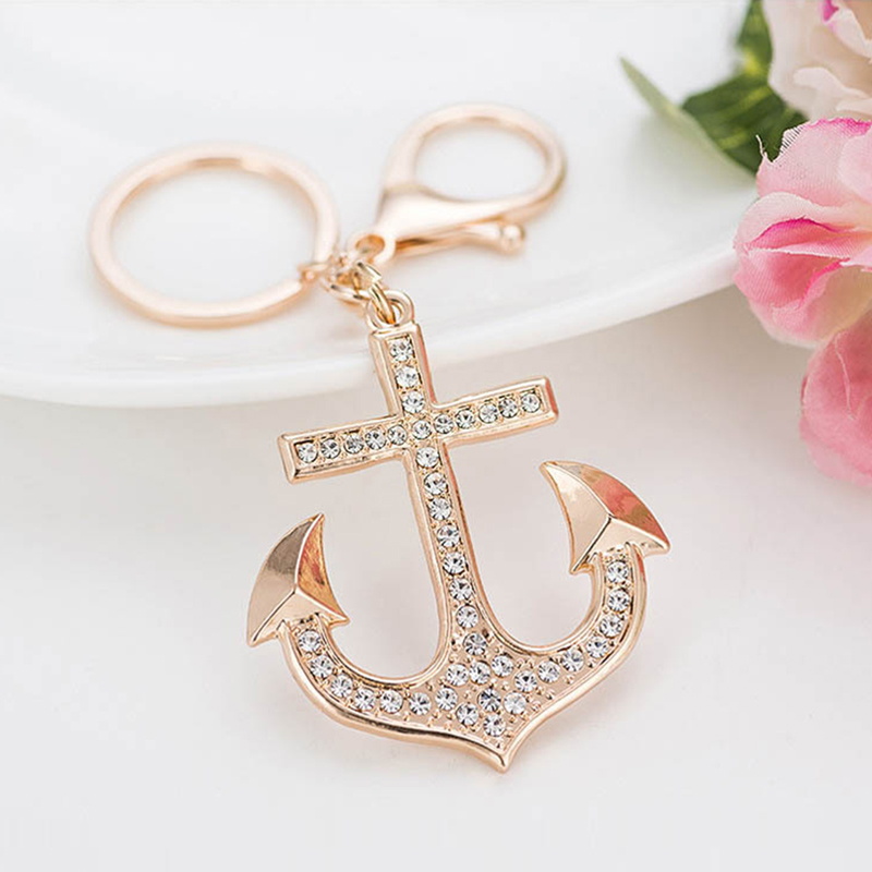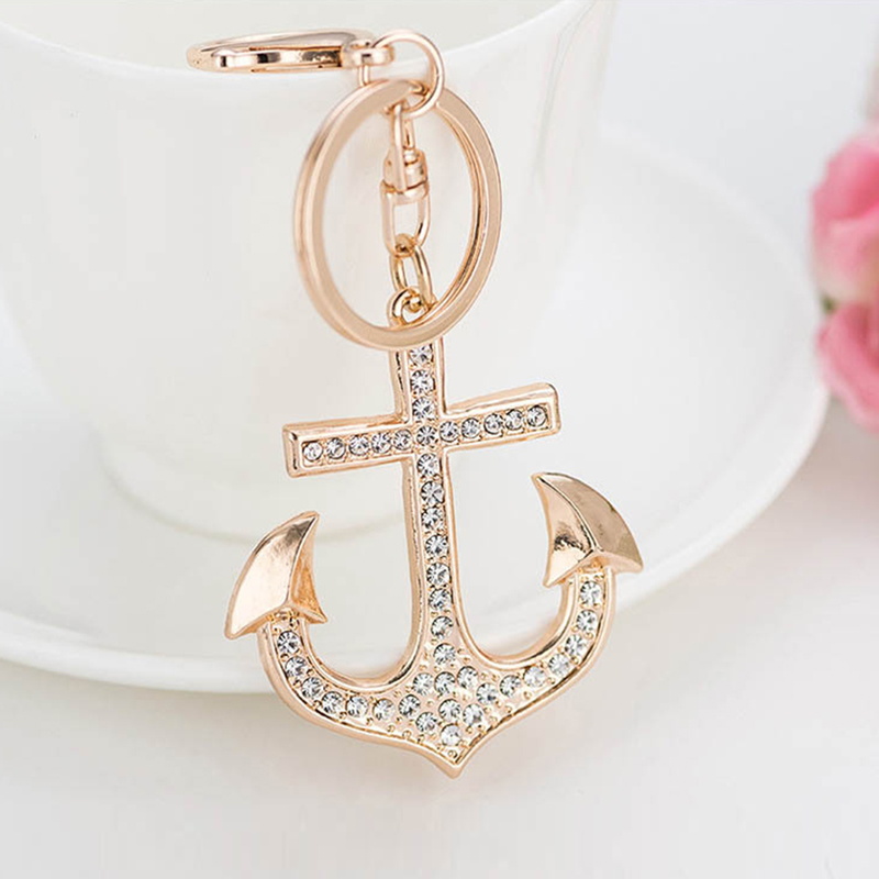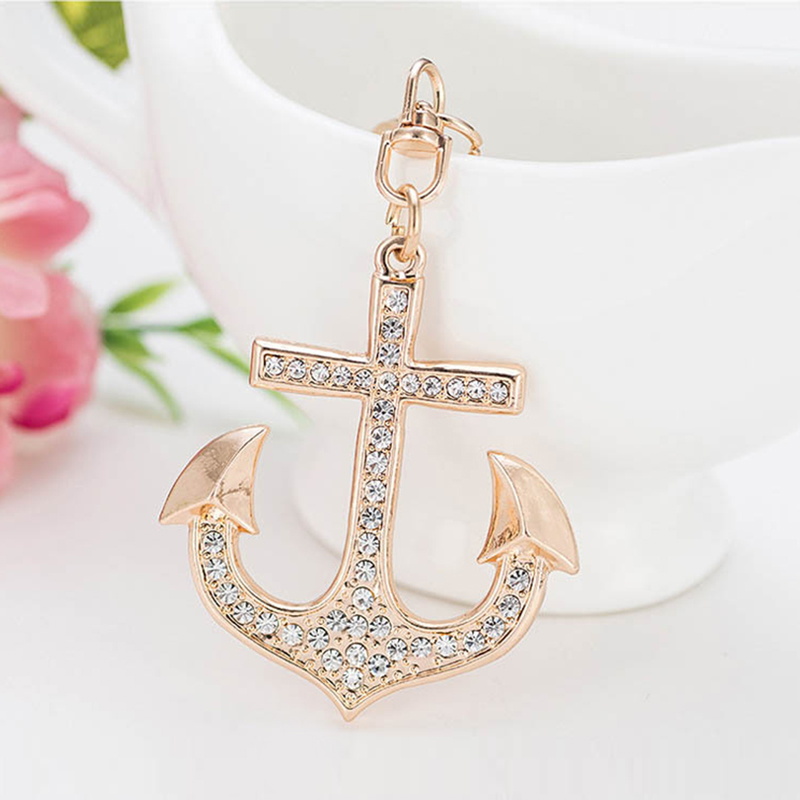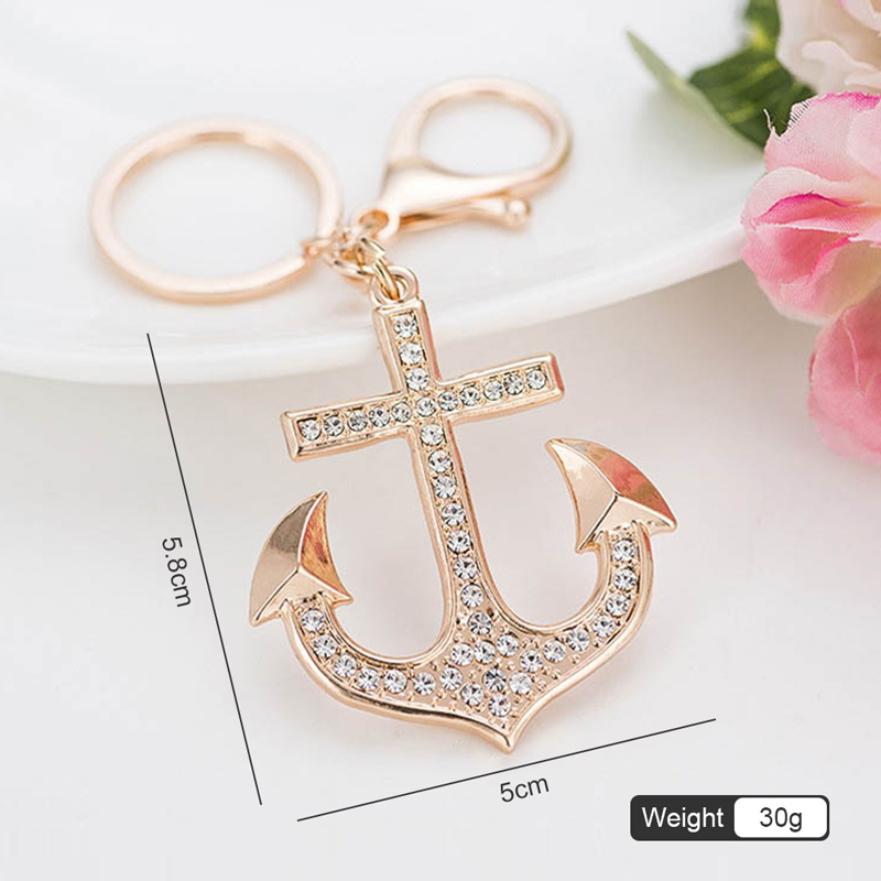 This rhinestone-embellished gold anchor keychain is a stylish accessory, ideal for key organization and adding a glamorous touch to bags, with a chic design for fashion lovers.