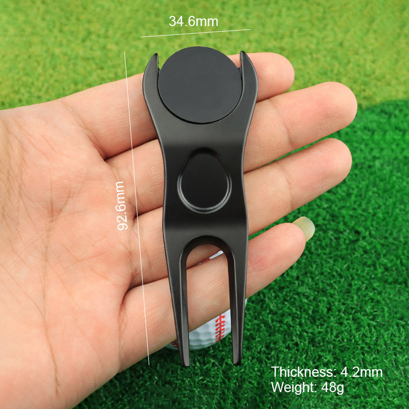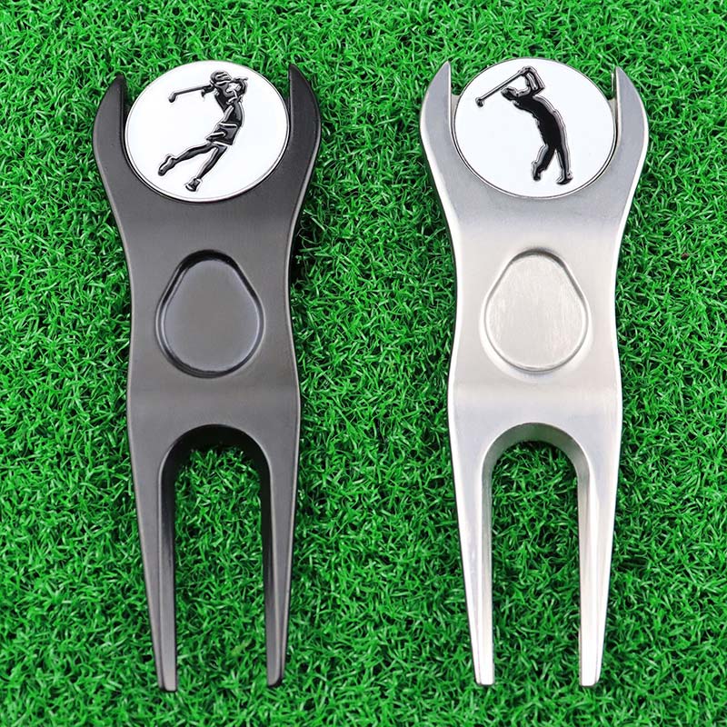 This 48g (92.6mm) tool (black/silver) features male/female golfer silhouettes on a magnetic ball marker. At 4.2mm thick, it’s durable for green repairs, compact to carry, and adds sporty, personalized style to your golf gear.