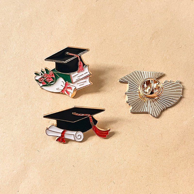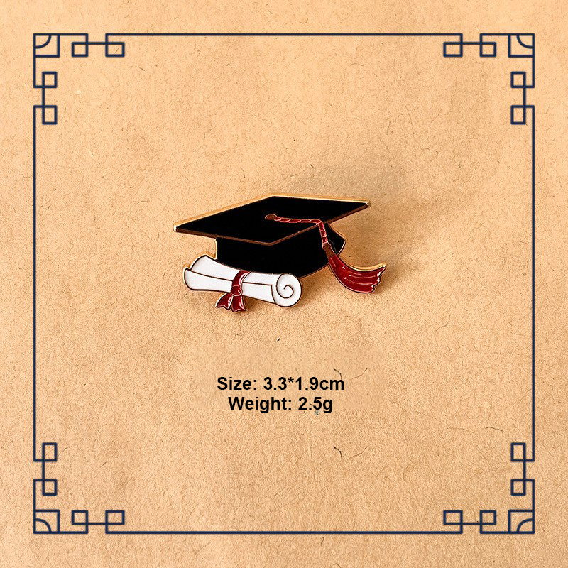 2 elegant pins (cap with book/bouquet, cap with diploma) — sleek black, vivid red accents. Perfect for graduates to mark milestones on bags/jackets; ideal as meaningful academic collectibles or gifts.
