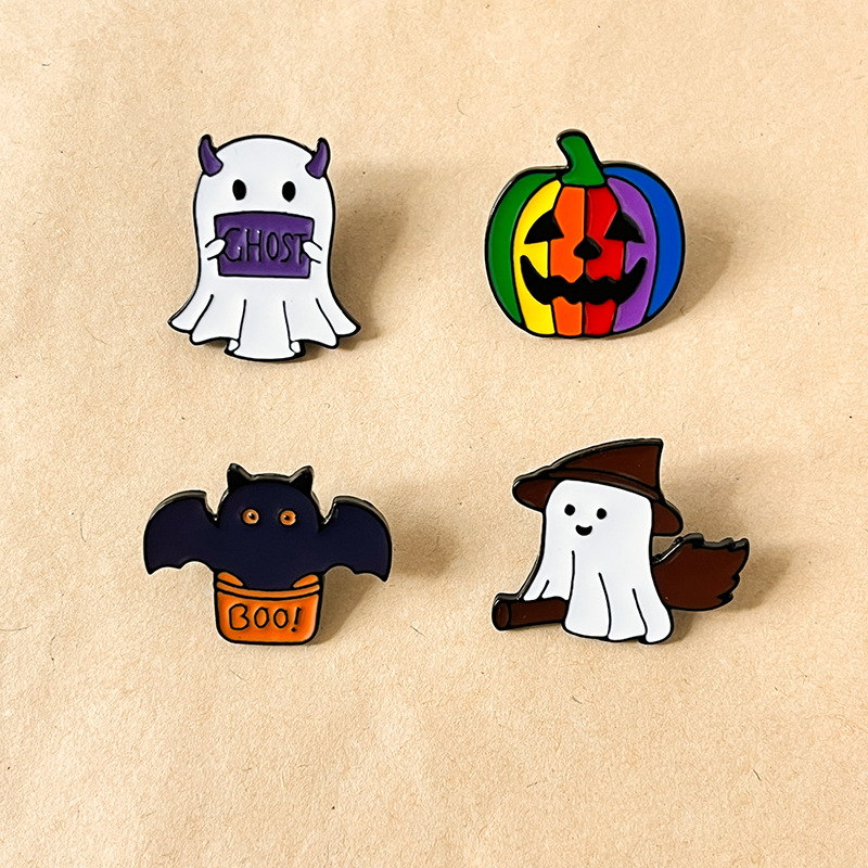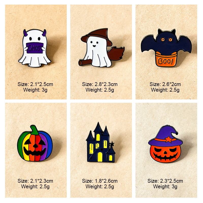 Features 6 glossy enamel designs (ghosts, pumpkins, bat, castle) with playful spooky vibes. Perfect for Halloween fans to add festive flair to bags/jackets—ideal for holiday styling or seasonal accessory decor.