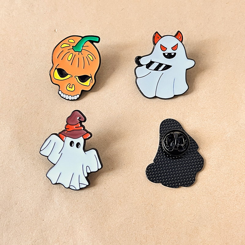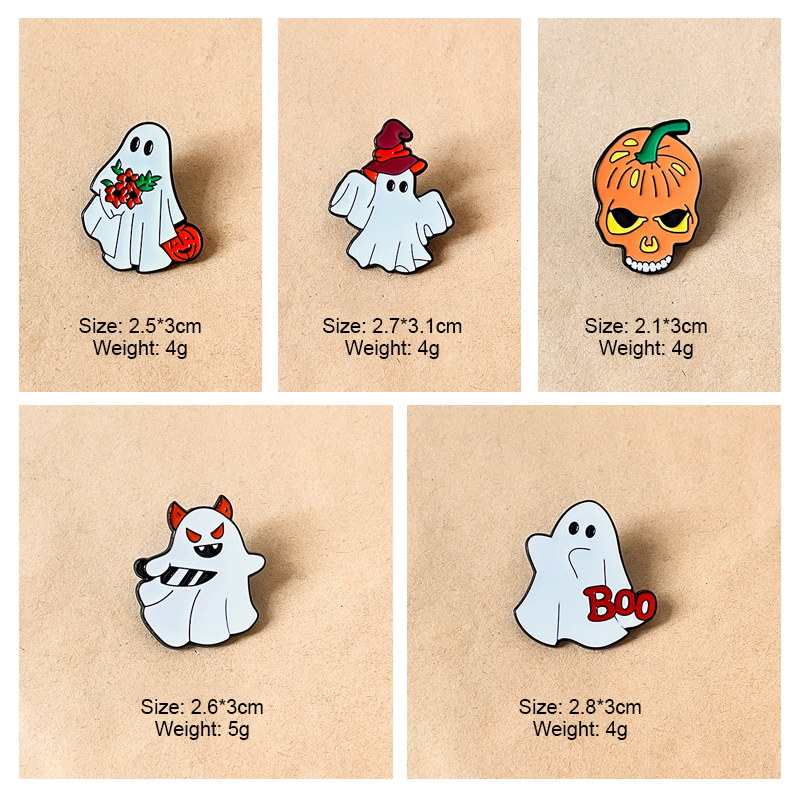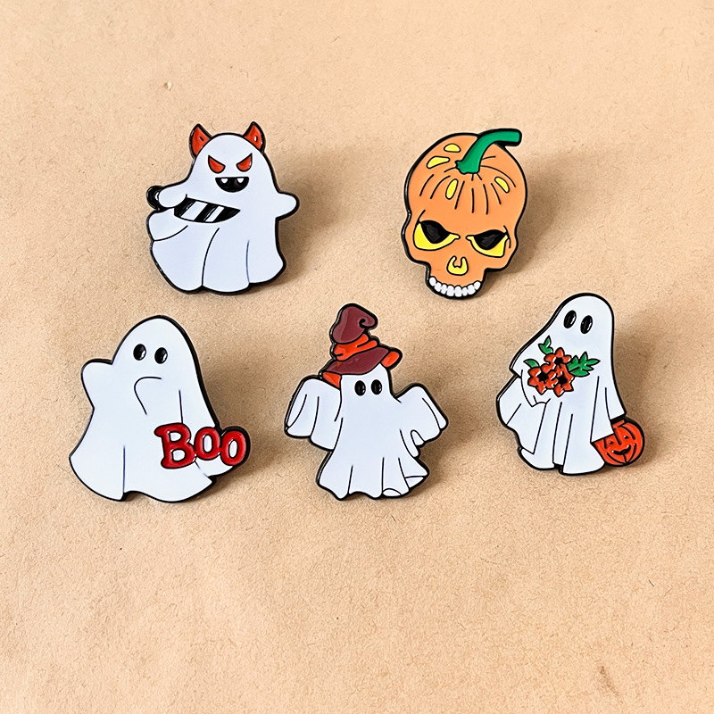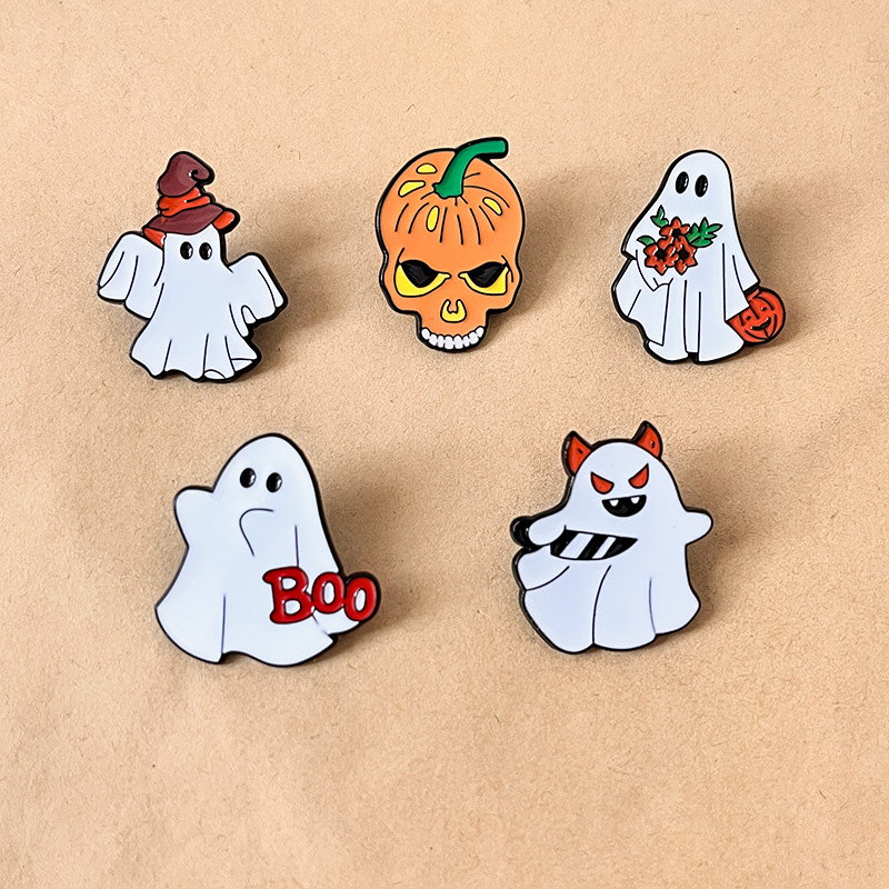 5 festive pins (devil ghost, witch ghost, "Boo" ghost, flower ghost, skull pumpkin) — vivid enamel, playful spooky vibes. Perfect for adding Halloween charm to bags/jackets; ideal for holiday lovers’ cute collectibles.