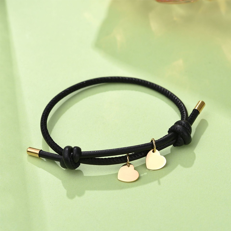 This adjustable leather cord bracelet (in black, pink, light blue, white) features two dainty gold heart charms. Its knotted closure ensures a custom fit, blending casual leather texture with sweet, minimalist accents—ideal for daily wear or gifting as a heartfelt accessory.