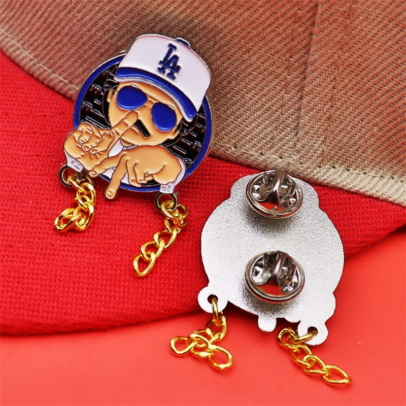 These pins come in two shapes: LA-logo cartoon heads (with sunglasses & gold chains) and an iconic figure design, all with sleek metal borders. Used to decorate caps or bags, they add unique edgy flair for LA fans, creating eye-catching, personalized touches to accessories.