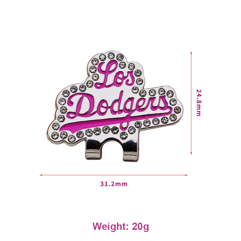 These pins feature the distinct silhouette of the Los Dodgers logo. Designed with rhinestone-adorned borders, blue/pink script lettering, and polished metal bases, they spotlight team identity while infusing sparkly, eye-catching details perfect for fans’ cap styling.