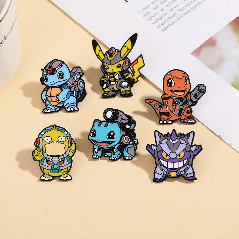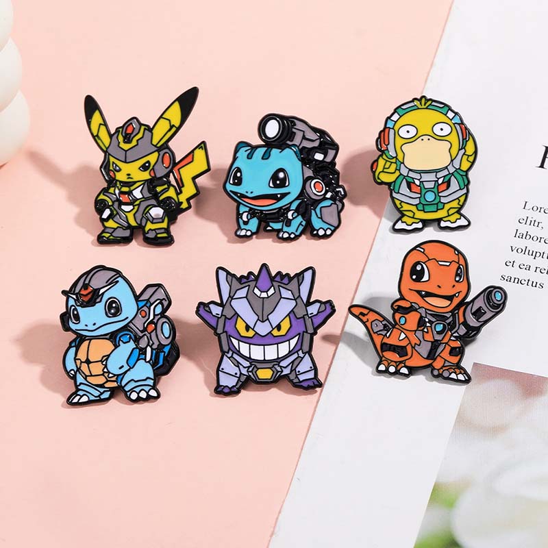 This mecha Pokémon pin set has 6 fan-favorite critters (Pikachu, Charmander, etc.) in futuristic gear—edgy, playful fandom charm. For Pokémon lovers, it adds cyber flair to bags/jackets, ideal for con styling or amping up daily outfits with geeky, high-tech personality.