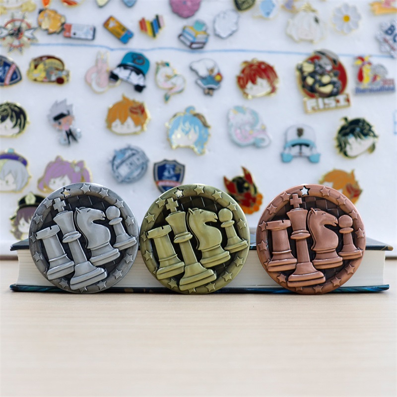 These circular chess medals—antique gold, silver, copper—feature star-edged borders and raised chess pieces (king, knight, rook). Ideal for chess tournaments, they honor players with a sleek, thematic design.