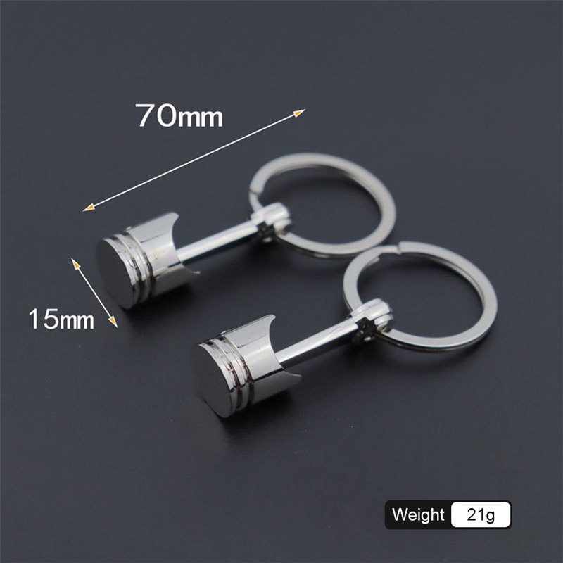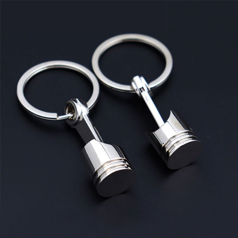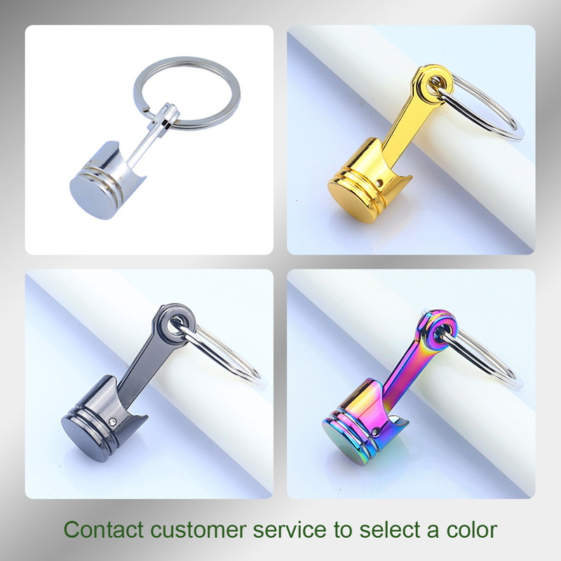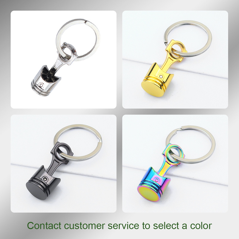 This keychain features engine piston designs in metallic finishes (silver, gold, black nickel, rainbow), showcasing a mechanical, automotive-inspired style. Its detailed, industrial aesthetic appeals to car enthusiasts, merging technical symbolism with stylish, collectible accessory design.