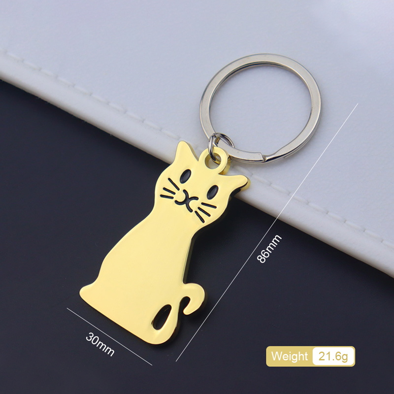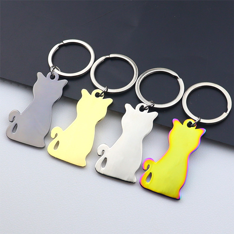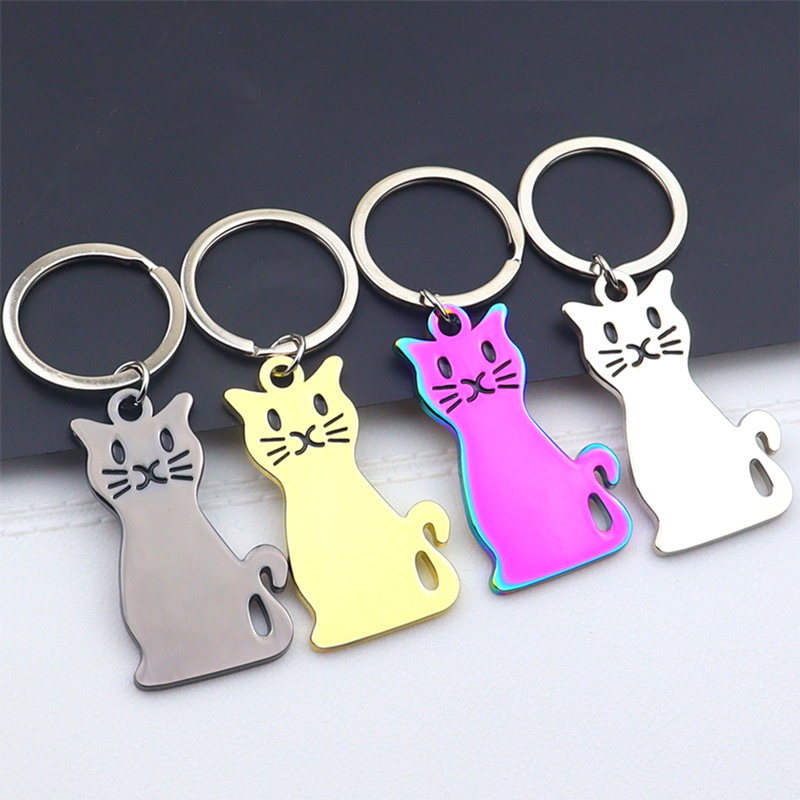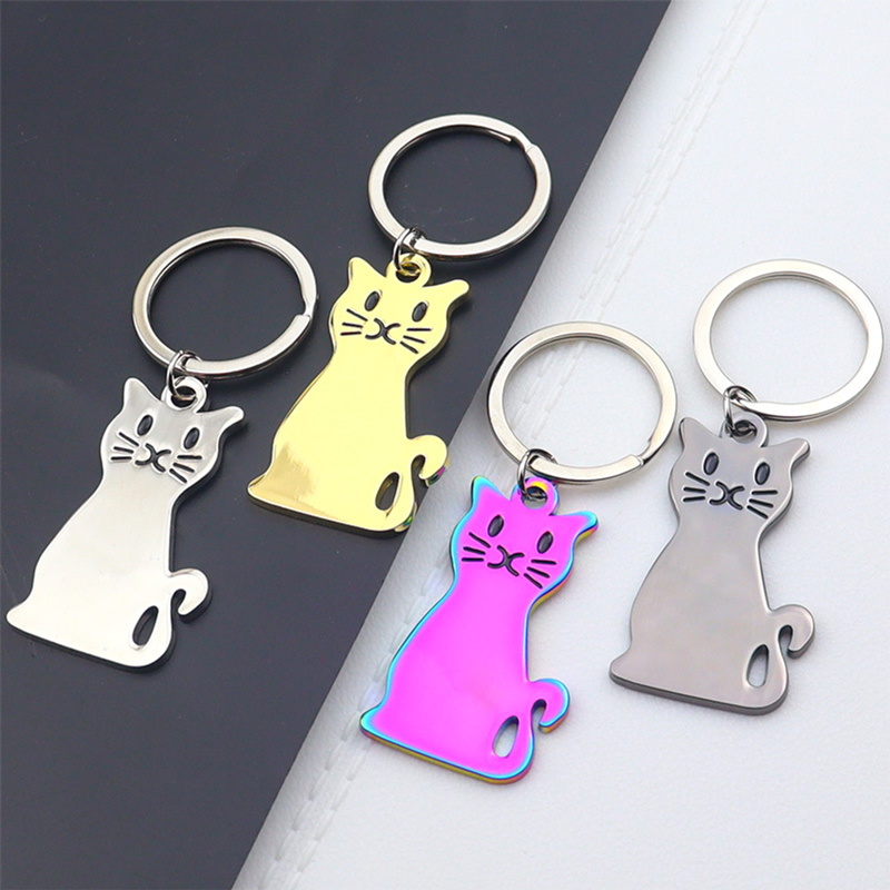 This keychain features cute cat silhouettes crafted from metal, available in silver, gold, rainbow plating, and gray. With a minimalist, pet-inspired design, the durable metallic construction appeals to cat lovers and those who favor stylish, whimsical accessories.