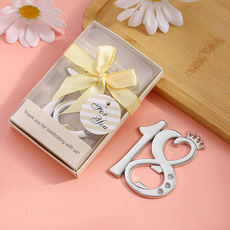 This 48g (6.4cm) gold/silver opener features the "18" shape with decorative crystals and a crown detail. It smoothly opens bottle caps, making it a perfect favor for 18th birthday parties or coming-of-age celebrations—both functional and a memorable keepsake.