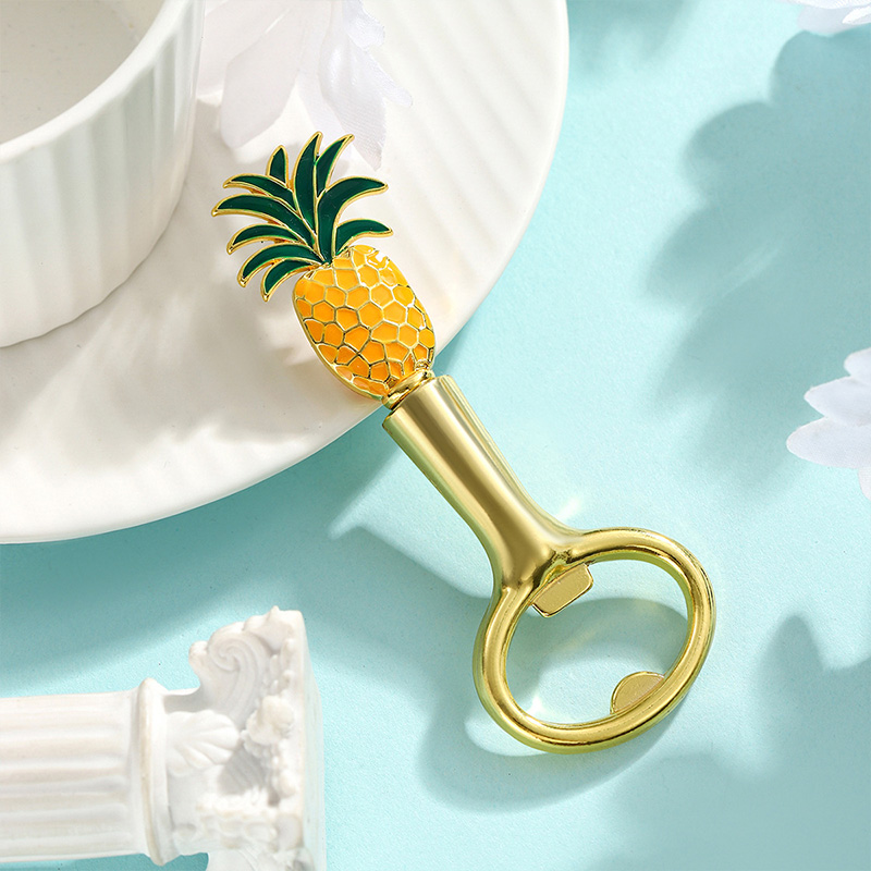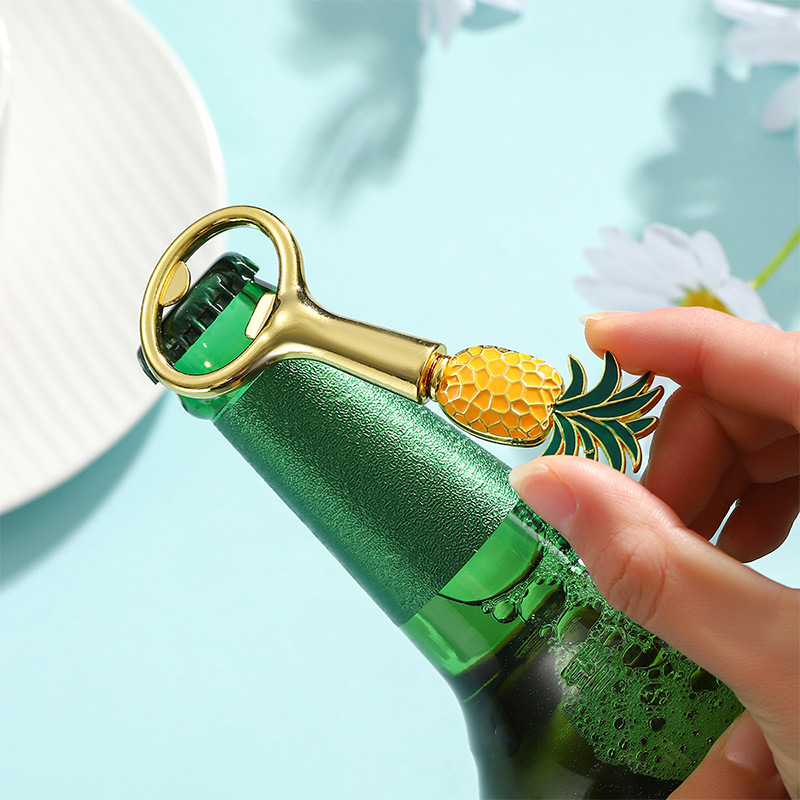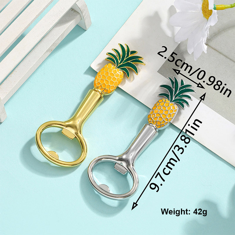 This 42g (9.7cm) opener features a vivid enamel pineapple top (yellow-green) paired with a gold/silver handle. It pops caps smoothly, blending tropical fruit charm with playful color—ideal for luau parties, summer gatherings, or a cheerful gift for pineapple lovers.