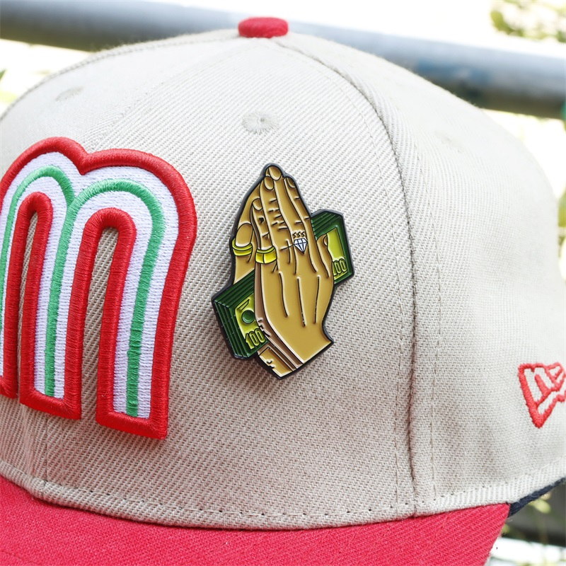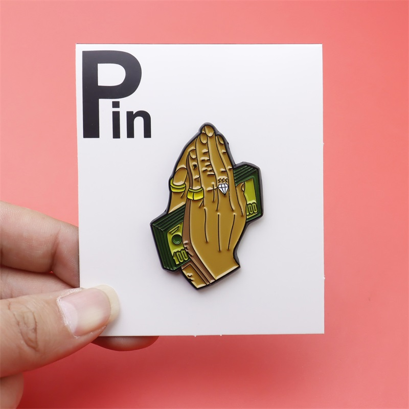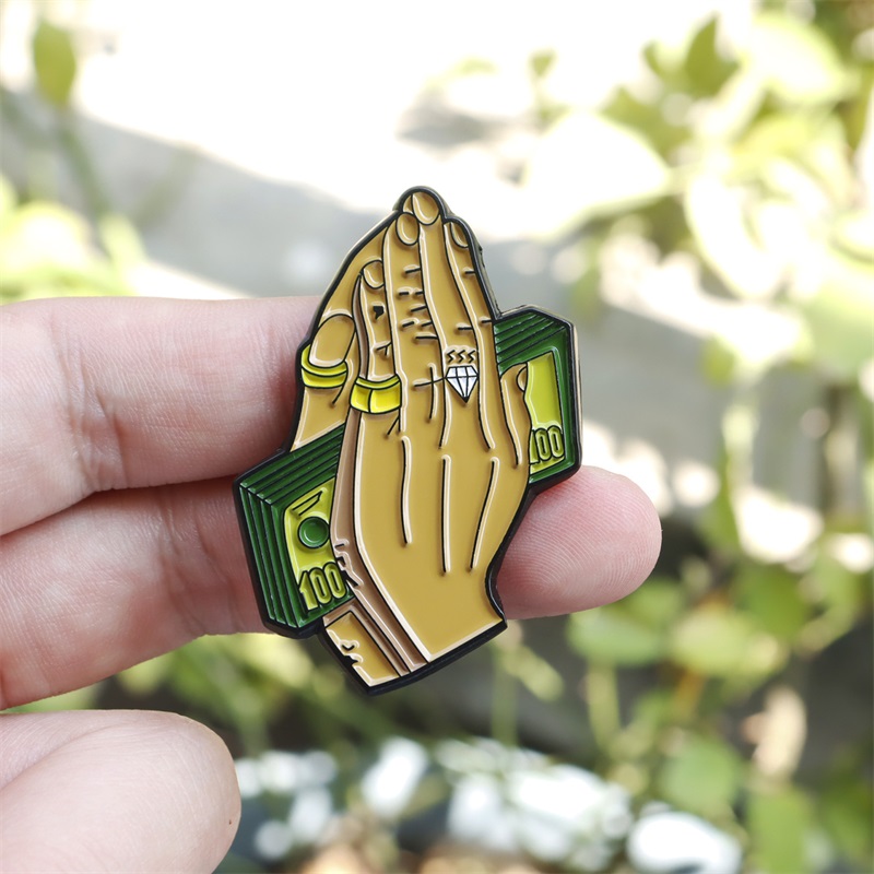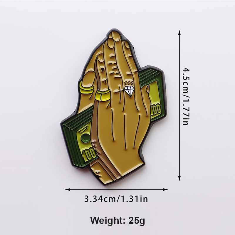 This pin features a unique, merged shape: praying hands layered over a stylized cash bill silhouette. Designs include glossy gold tones, diamond ring details, and vibrant green accents—blending symbolic motifs with bold, modern styling for a standout, personality-driven accessory.