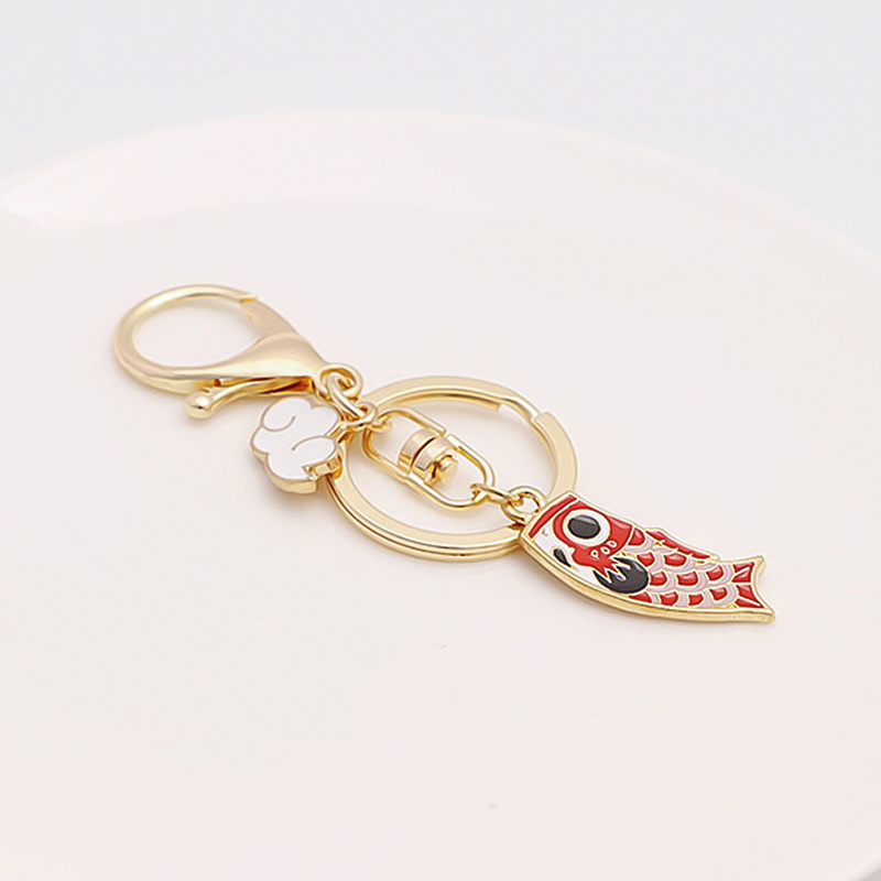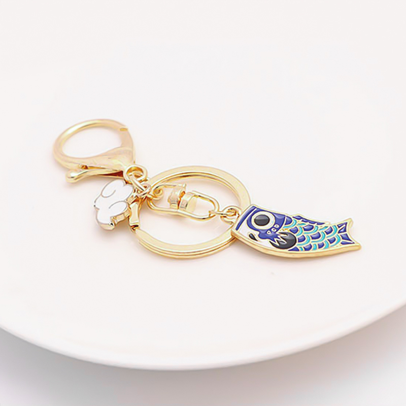 These keychains feature colorful koi fish enamel charms (red and blue) with intricate patterns, paired with gold metal rings, clasps, and cloud-shaped accents. The detailed enamel work and metallic finish create a vibrant, culturally inspired design.