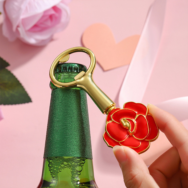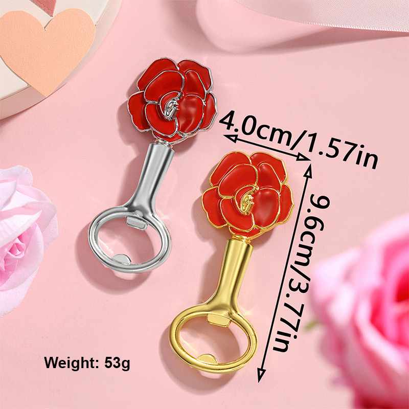 This 53g (9.6cm) opener features a vivid red enamel rose top (with petal details) paired with gold/silver handles. It pops caps smoothly, blending romantic floral charm with elegant style—ideal for weddings, Valentine’s parties, or a heartfelt gift for flower-loving friends.