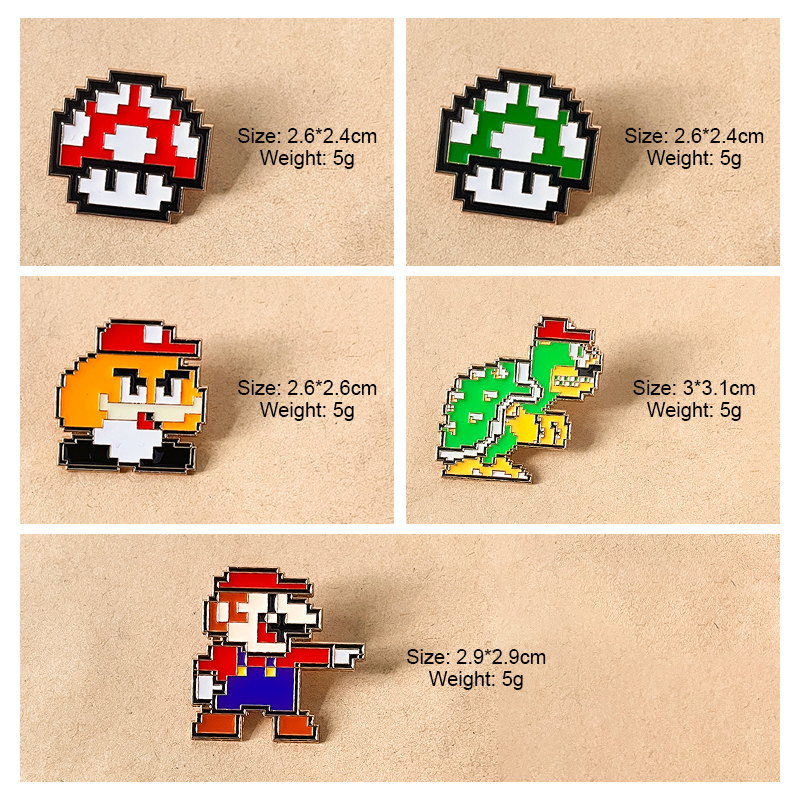 Features iconic Mario characters (Mario, Bowser, mushrooms) in retro 8-bit pixel designs with vibrant enamel. Ideal for gaming fans to decorate jackets, bags, or hats—adding nostalgic, playful charm to daily styles.