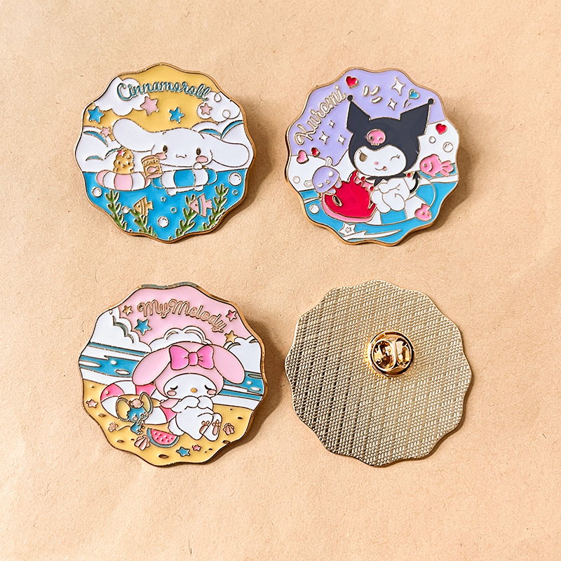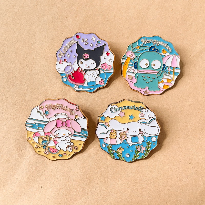 Features Sanrio characters (Cinnamoroll, My Melody, etc.) in beach scenes with vibrant, playful enamel. Ideal for adding cute summer flair to bags, jackets, or hats—perfect for fandom styling or seasonal accessory accents.