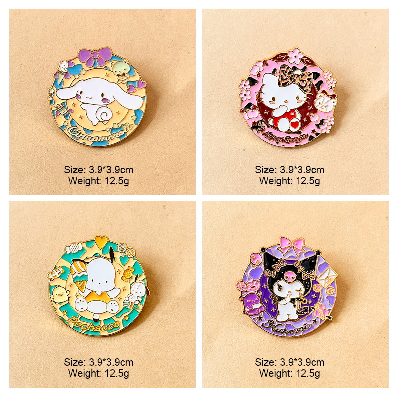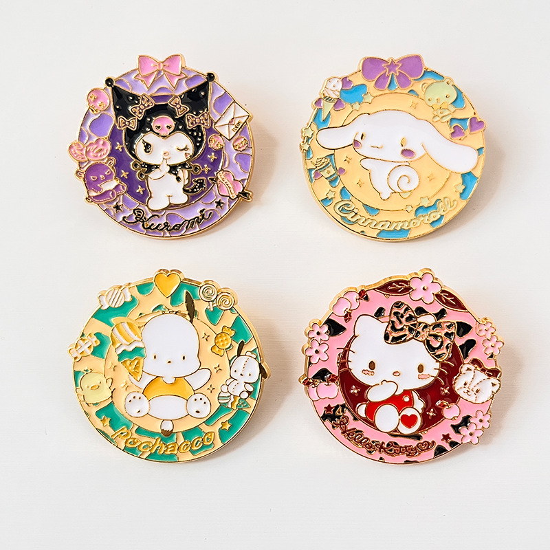 4 vibrant Sanrio pins (Pochacco, Kuromi, Hello Kitty, Cinnamoroll) with cute decorative details—fan-loved flair. Perfect for styling bags/jackets; ideal for daily wear or Sanrio collectible decor.