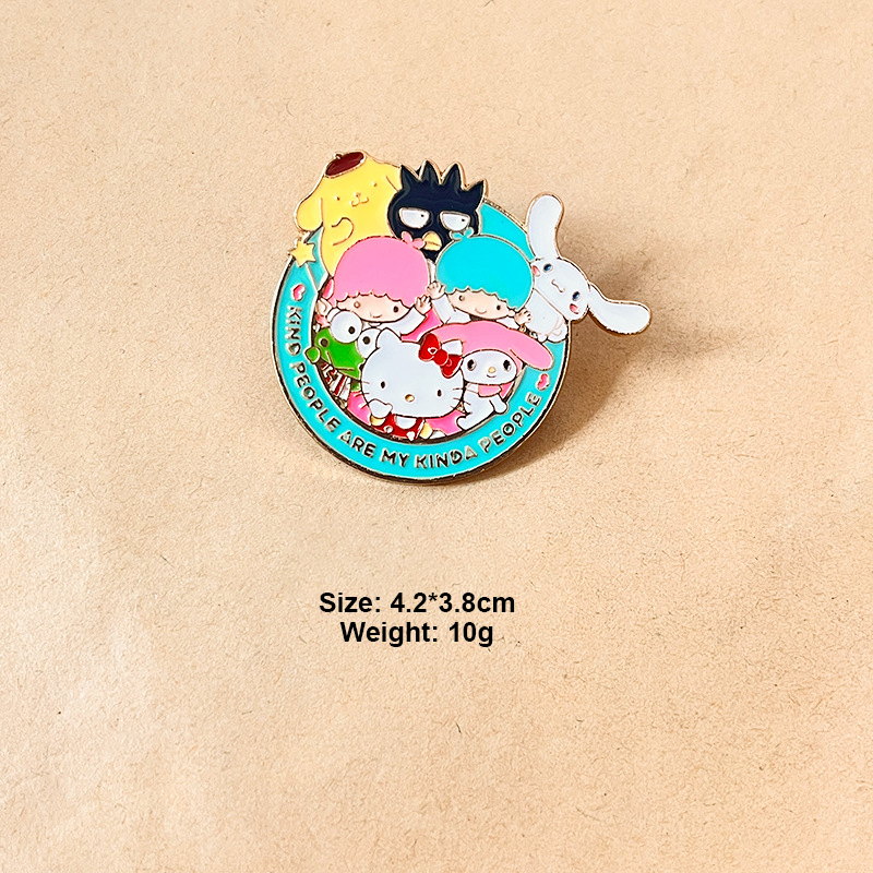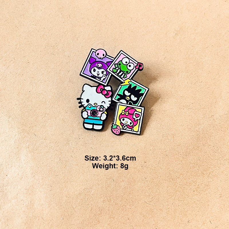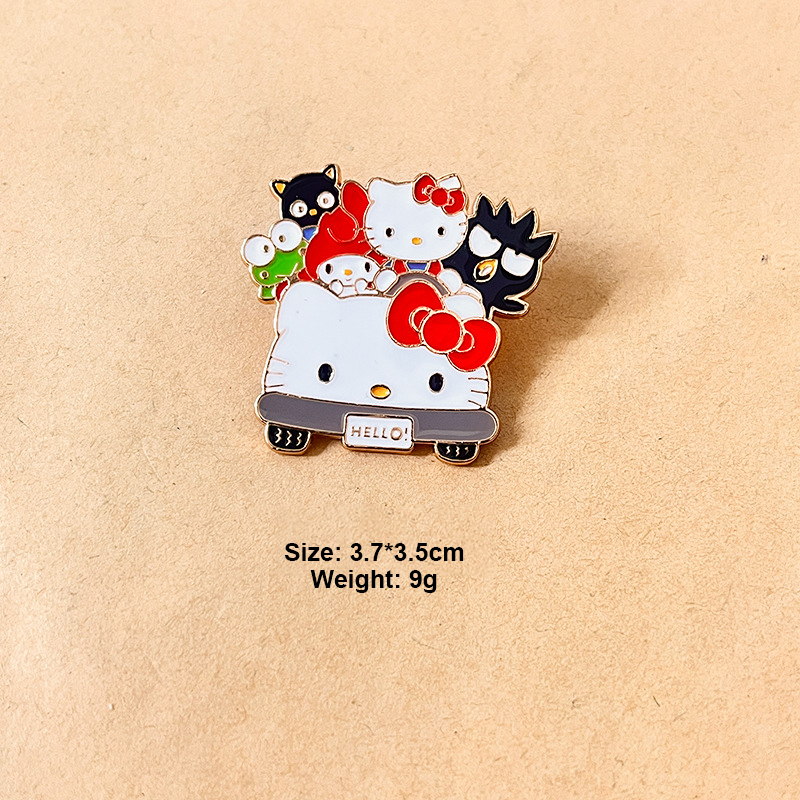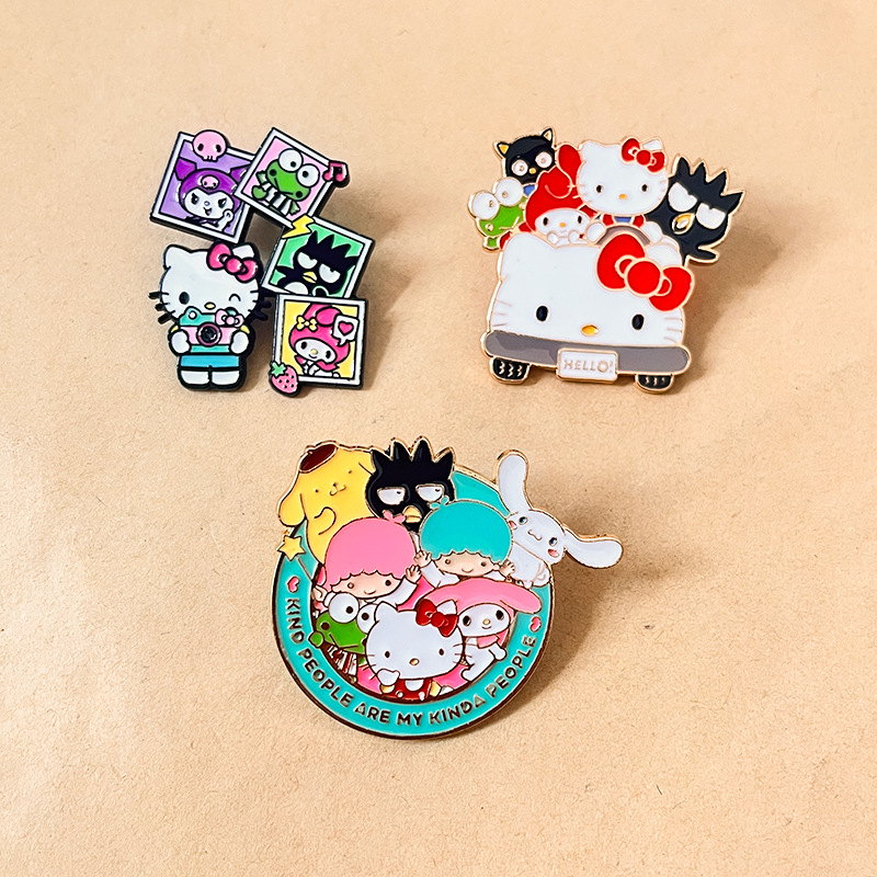 Features Hello Kitty & Sanrio friends in playful group designs (photo collage, car ride, circle badge) with vibrant enamel. Ideal for fans to decorate bags/jackets—adds cheerful, iconic charm to daily styles or Sanrio-themed collections.