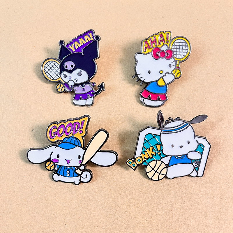 These vibrant enamel pins (crisp outlines) feature Sanrio characters (Kuromi, Hello Kitty, etc.) in sports gear, paired with fun exclamations. Blending iconic fandom charm with lively athletic vibes, they add cheerful flair to bags/jackets as beloved collectible keepsakes.