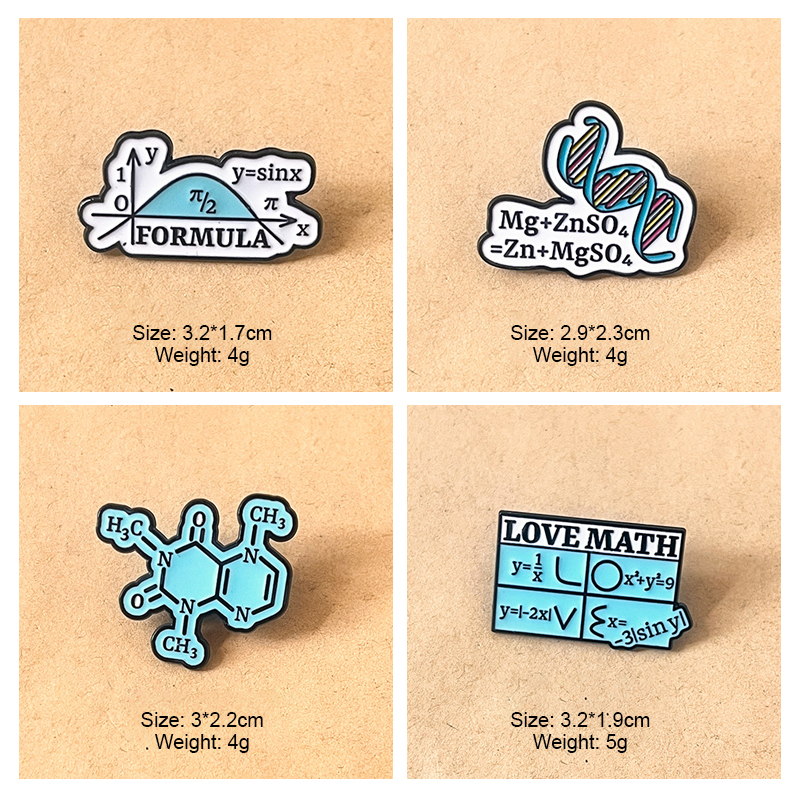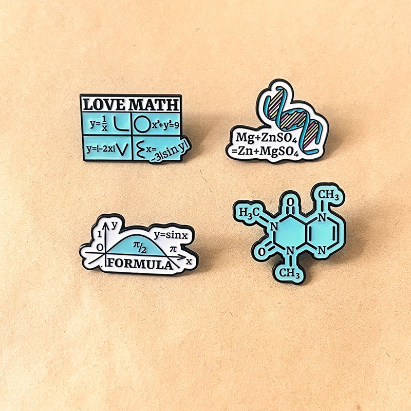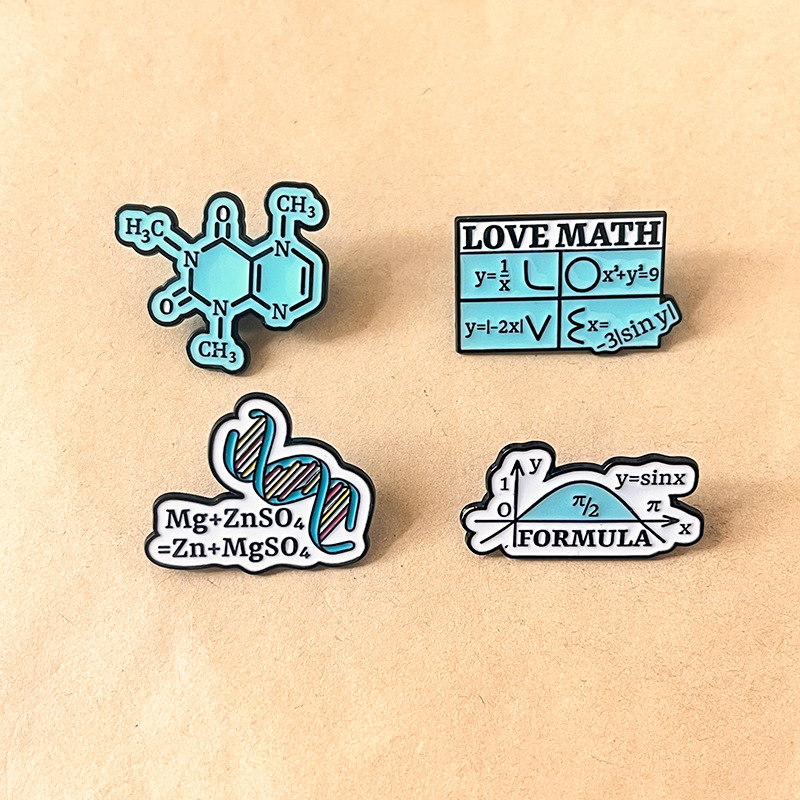 These pins take subject-themed shapes (chemistry structure, math equation board, DNA helix) with crisp, vivid enamel. They attach easily to backpacks, lab coats, or lanyards—adding clever academic charm to daily items, ideal for science/math lovers’ styling or collection.