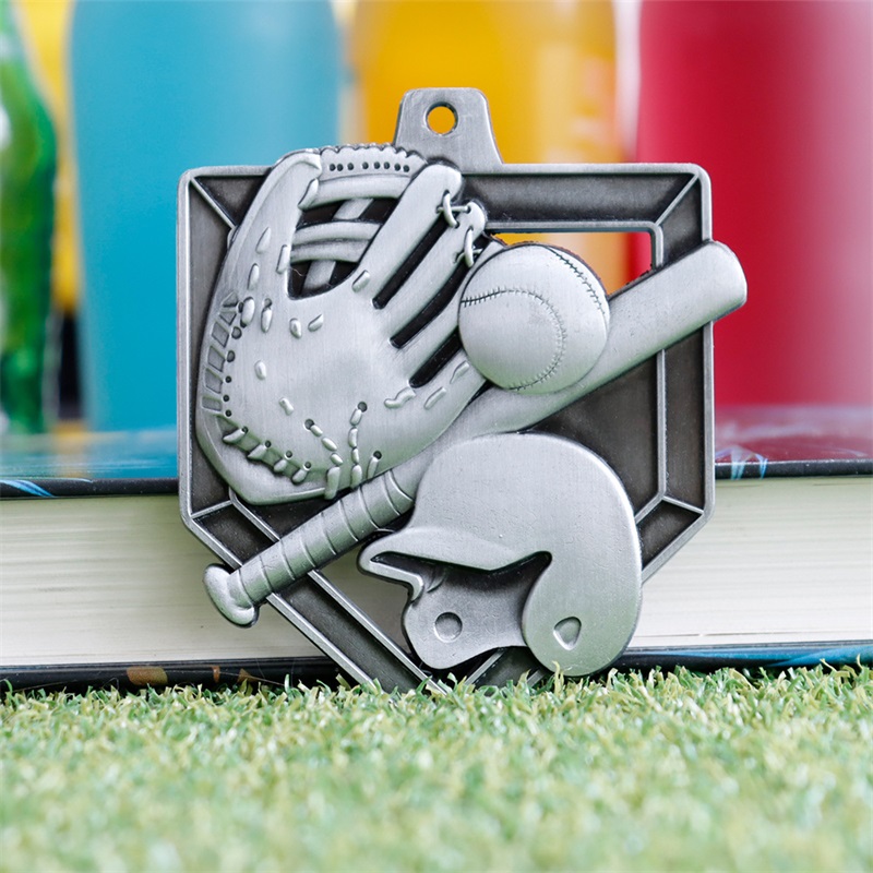 These shield-shaped baseball medals—crafted in antique gold, silver, and copper—boast sleek cut-out designs framing detailed motifs of gloves, bats, balls, and helmets. Their angular, structured form adds a bold, sporty flair, ideal for honoring athletes at baseball tournaments and elevating award ceremony presentations.