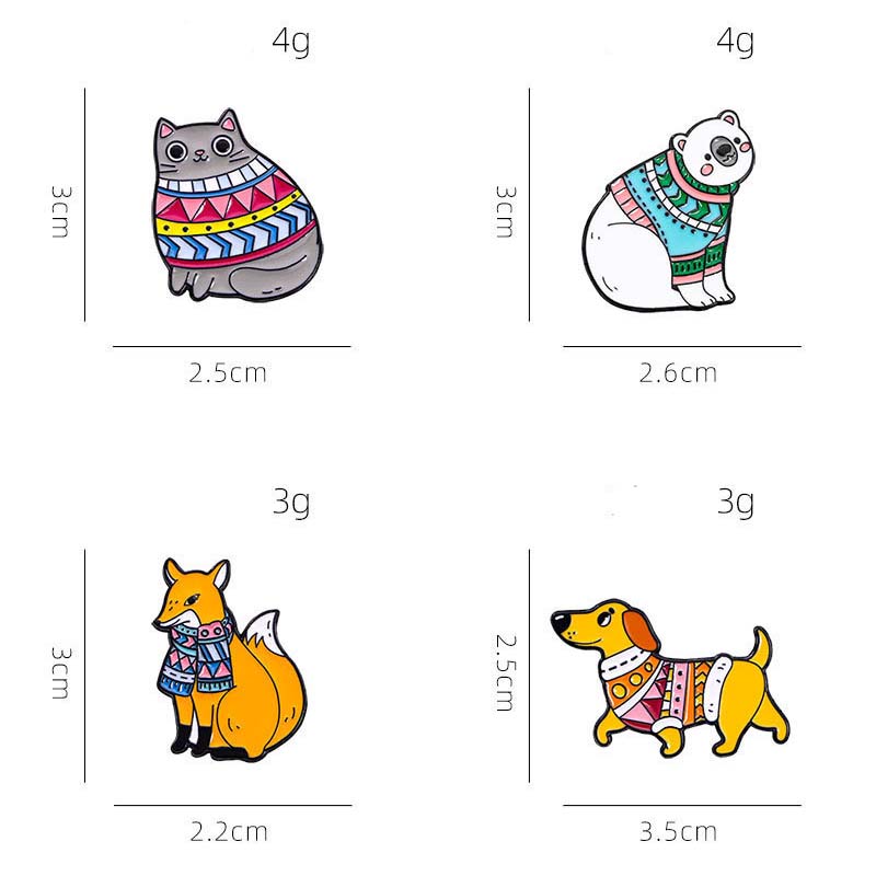Features 4 cute animals (fox, dog, polar bear, cat) in colorful knit sweaters—warm, playful charm. Perfect for animal lovers to add cozy flair to bags/jackets, ideal for fall/winter styling or whimsical decor.