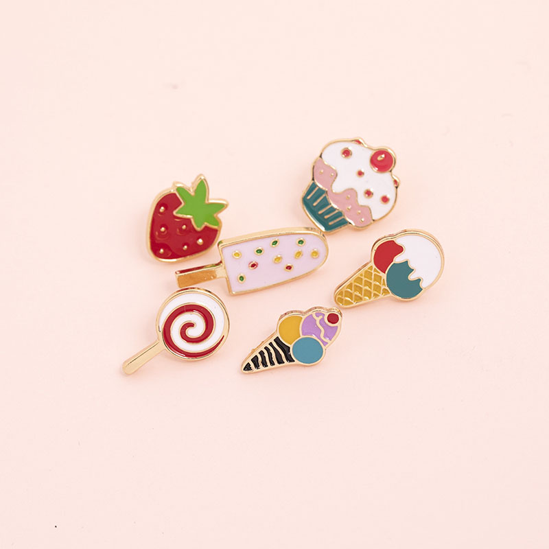 This sweet treats pin set has 5 glossy designs (lollipop, cupcake, strawberry, popsicle, ice cream)—colorful, playful nods to desserts. For sweet lovers, it adds cheerful flair to bags/jackets, ideal for daily styling or charming sweet-themed accessory decor.