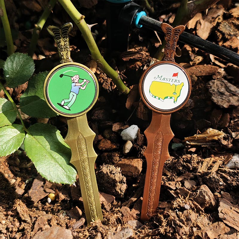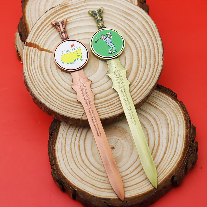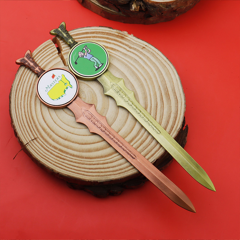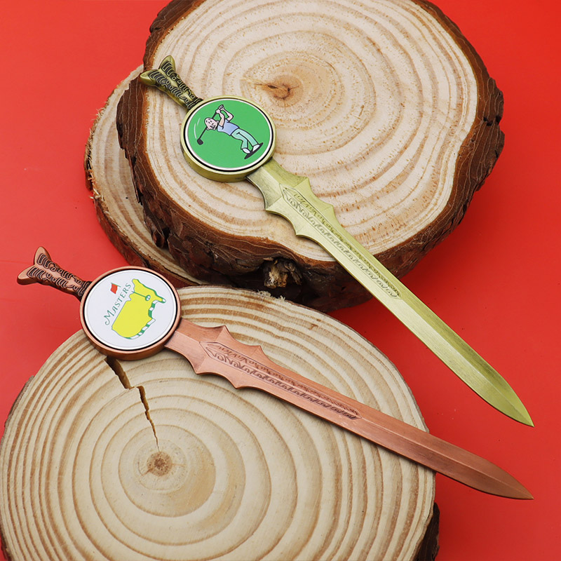 This 40g (14.9cm) sword-styled tool (copper/gold) fixes green divots. It features a magnetic marker (with Masters/golfer designs) and intricate blade detailing, merging medieval-inspired flair with on-course utility—ideal for golfers who love unique, themed gear.