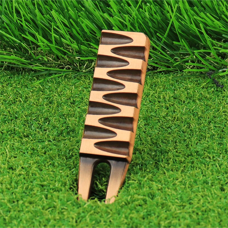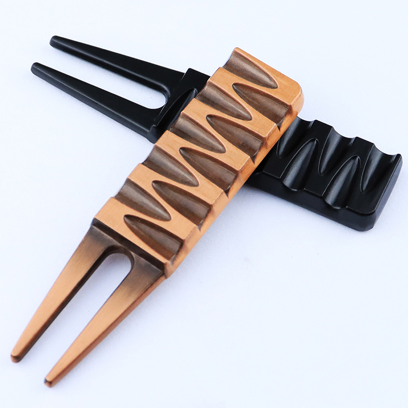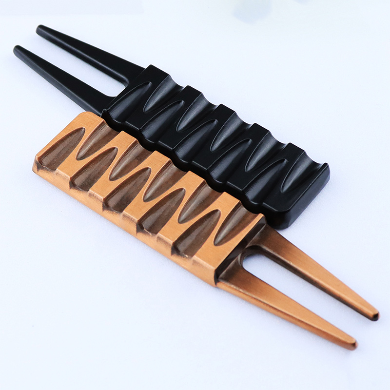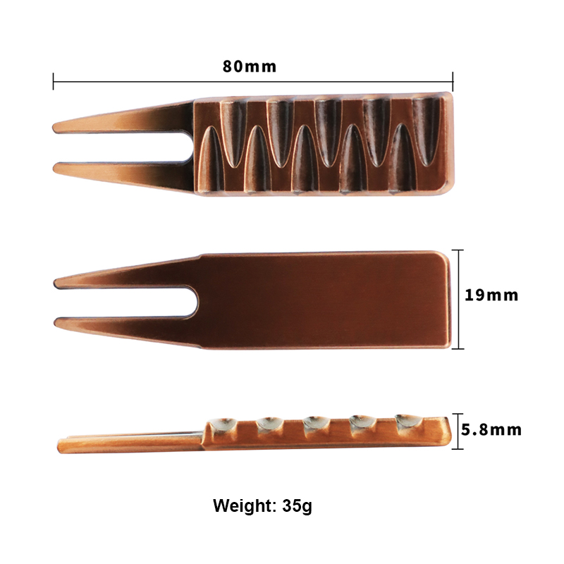 This 80mm compact divot tool (35g lightweight) features a unique textured surface (black/copper finishes) for firm grip. Durable, sleek, and easy to carry—ideal for effortless green repairs, blending practicality with modern, stylish design for on-course convenience.