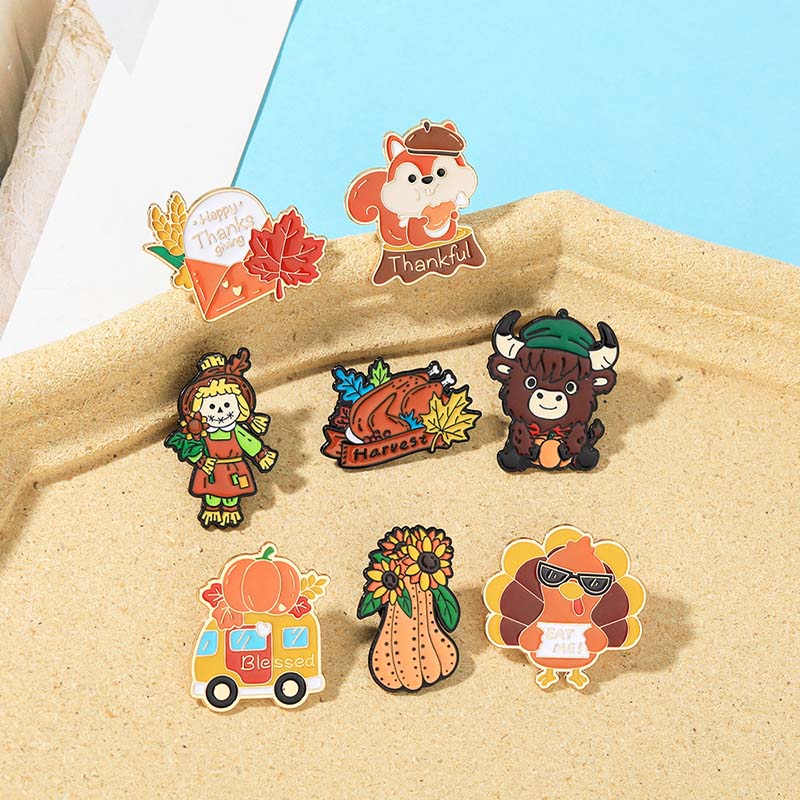 These 7 cozy Thanksgiving pins brim with harvest charm: a "Thankful" squirrel, "Harvest" turkey, "Blessed" pumpkin truck, plus a scarecrow and sunflowers—vibrant fall tones amplify their warm, festive vibe. Ideal for adding seasonal cheer to bags/jackets or displaying as holiday collectibles.