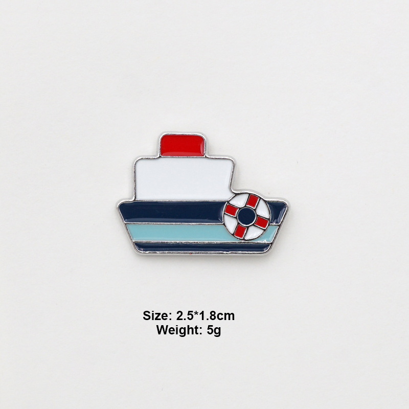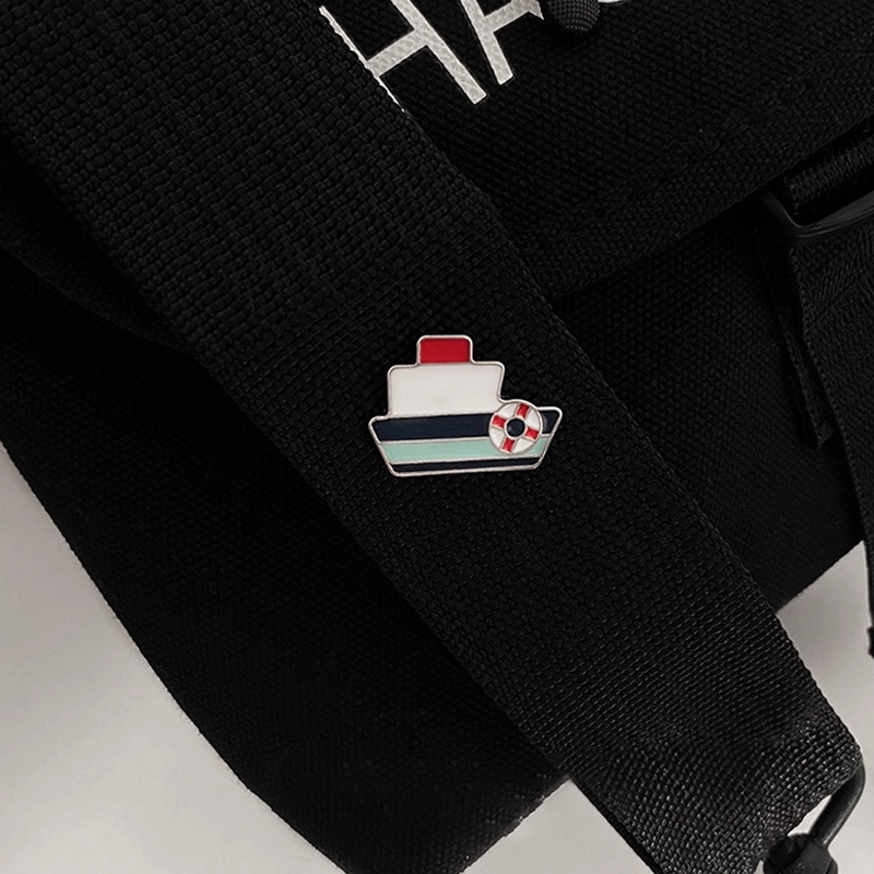 This vibrant pin features a stylized ship with striped hull, white superstructure, and a red-white life preserver—blending playful nautical charm with crisp, colorful design. Perfect for adding coastal flair to bags/jackets or collecting as a cheerful maritime keepsake.