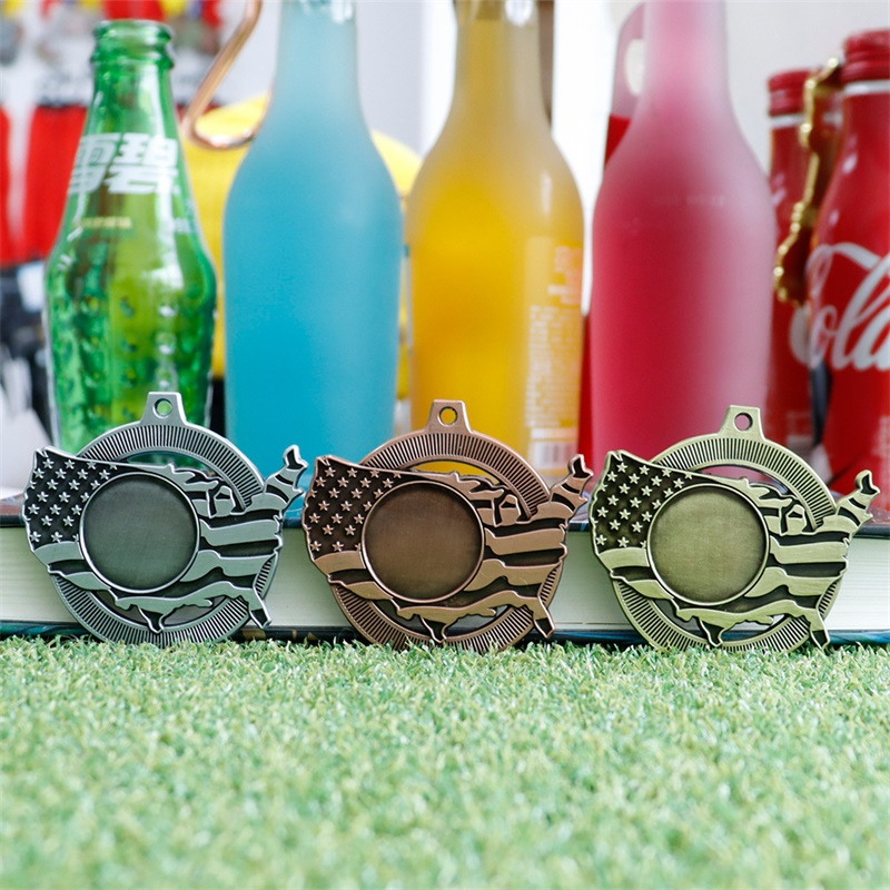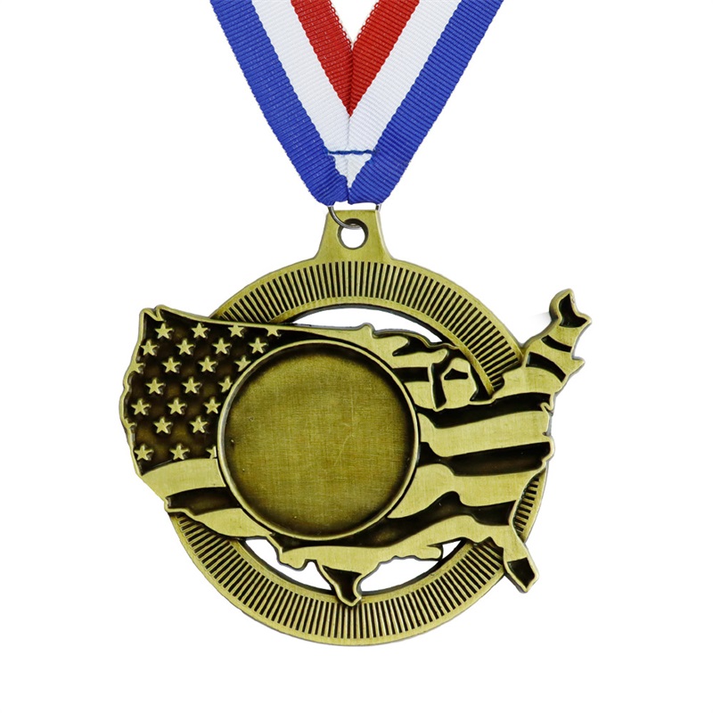 Crafted from antique gold/antique silver/antique red copper metal, this medal features a distinct USA map silhouette (paired with flag-inspired detailing) for a patriotic vibe. Its central blank panel is designed to fit custom stickers—ideal for adding event logos, participant names, or achievement labels. Perfect for honoring excellence at American-themed competitions, community events, or youth programs, it blends national symbolism with flexible, personalized recognition.